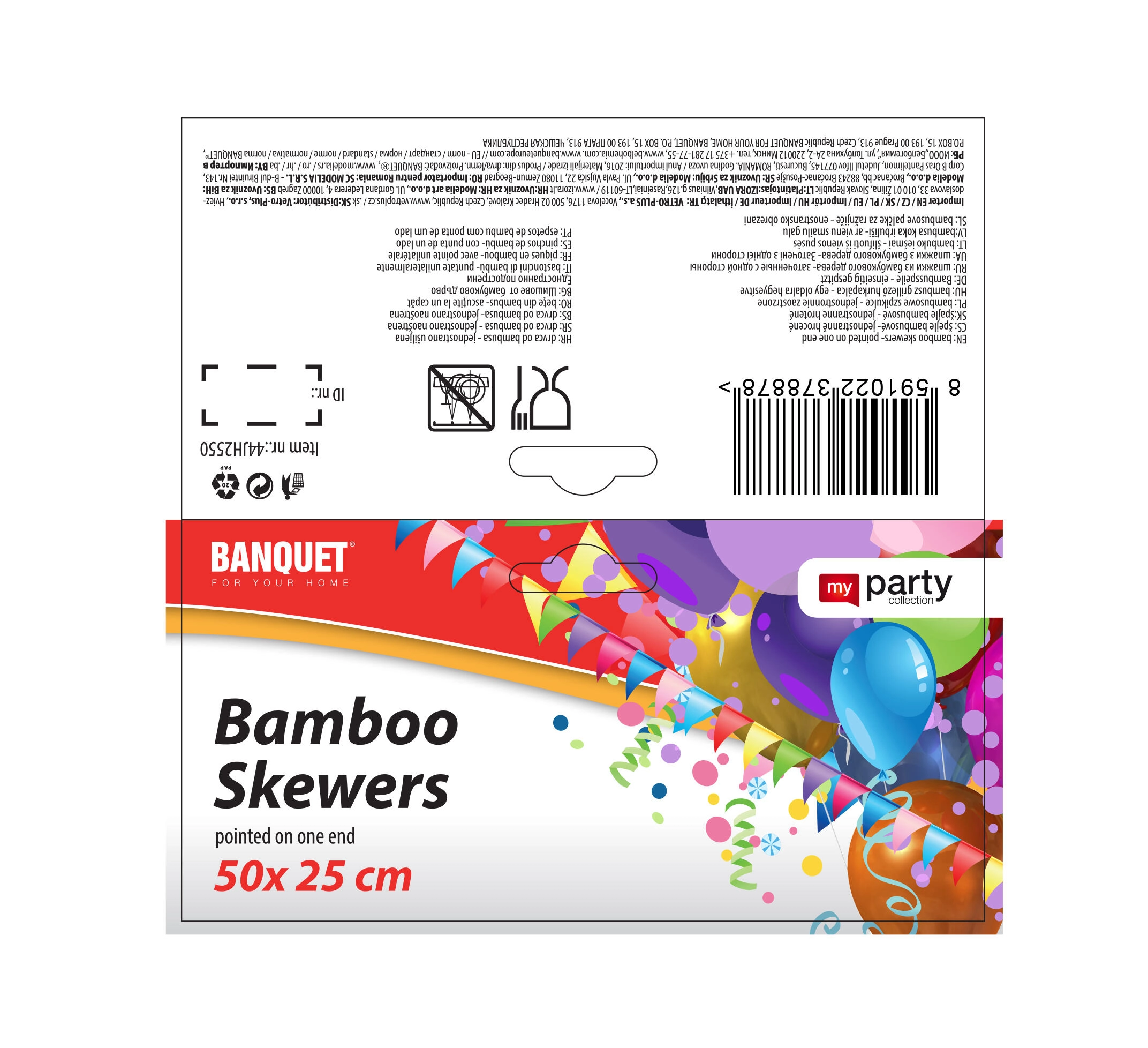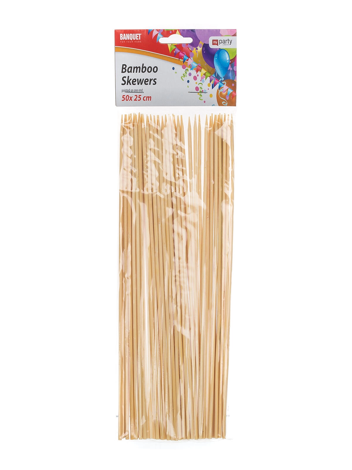 Univerzálna dĺžka 25 cm je ideálna na gril aj do rúry, ale aj na studené variácie na oslavách a garden party. Balenie 50 ks je praktické na rodinné akcie aj väčšie pohostenie.
