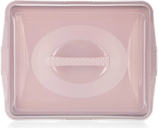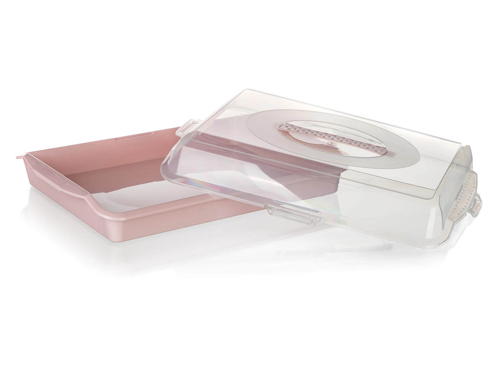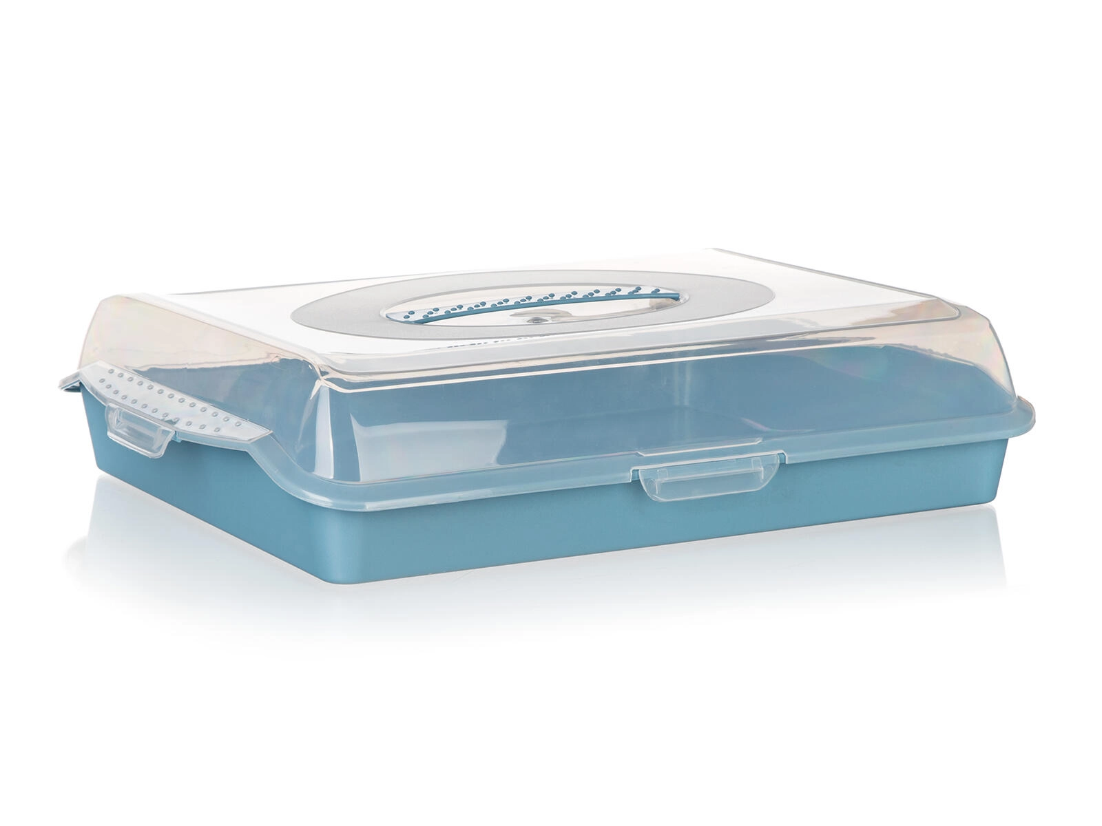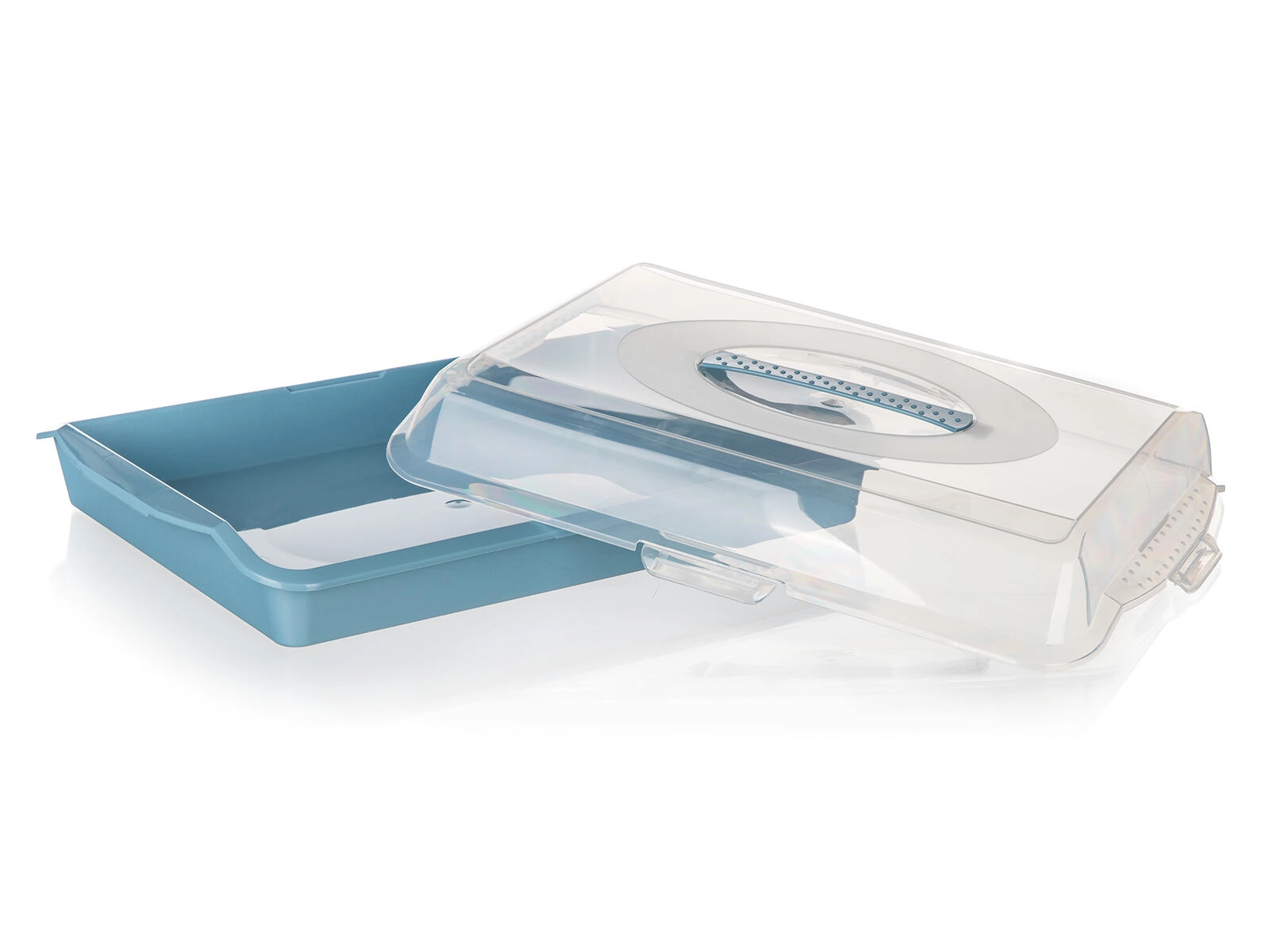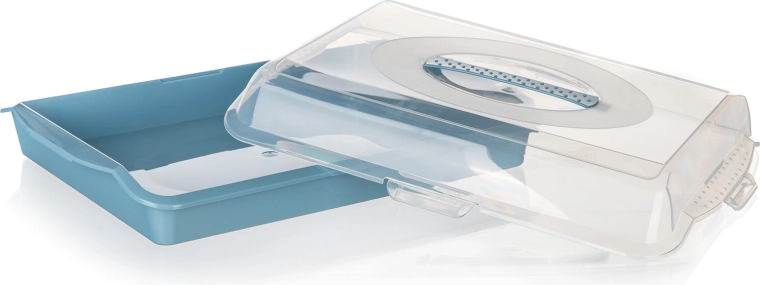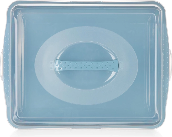 Praktický plastový podnos s vekom Culinaria s rozmermi 45 × 35 × 10,5 cm je ideálny na prehvoz a uchovávanie koláčov, tort a zákuskov. Priesvitné veko s bezpečnými klipmi chráni obsah pred prachom a poškodením, zatiaľ čo nízky profil umožňuje pohodlné stohovanie. Dostupný v mixe farieb – ružová a modrá.