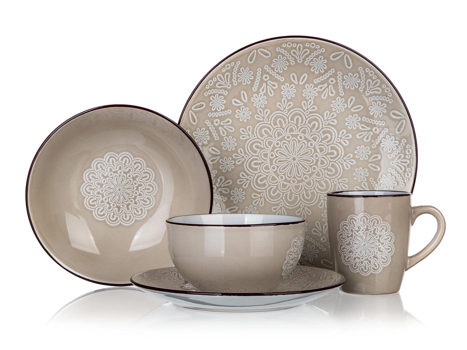 - lesklá glazúra, reliéfny čipkovaný/mandalový dekor