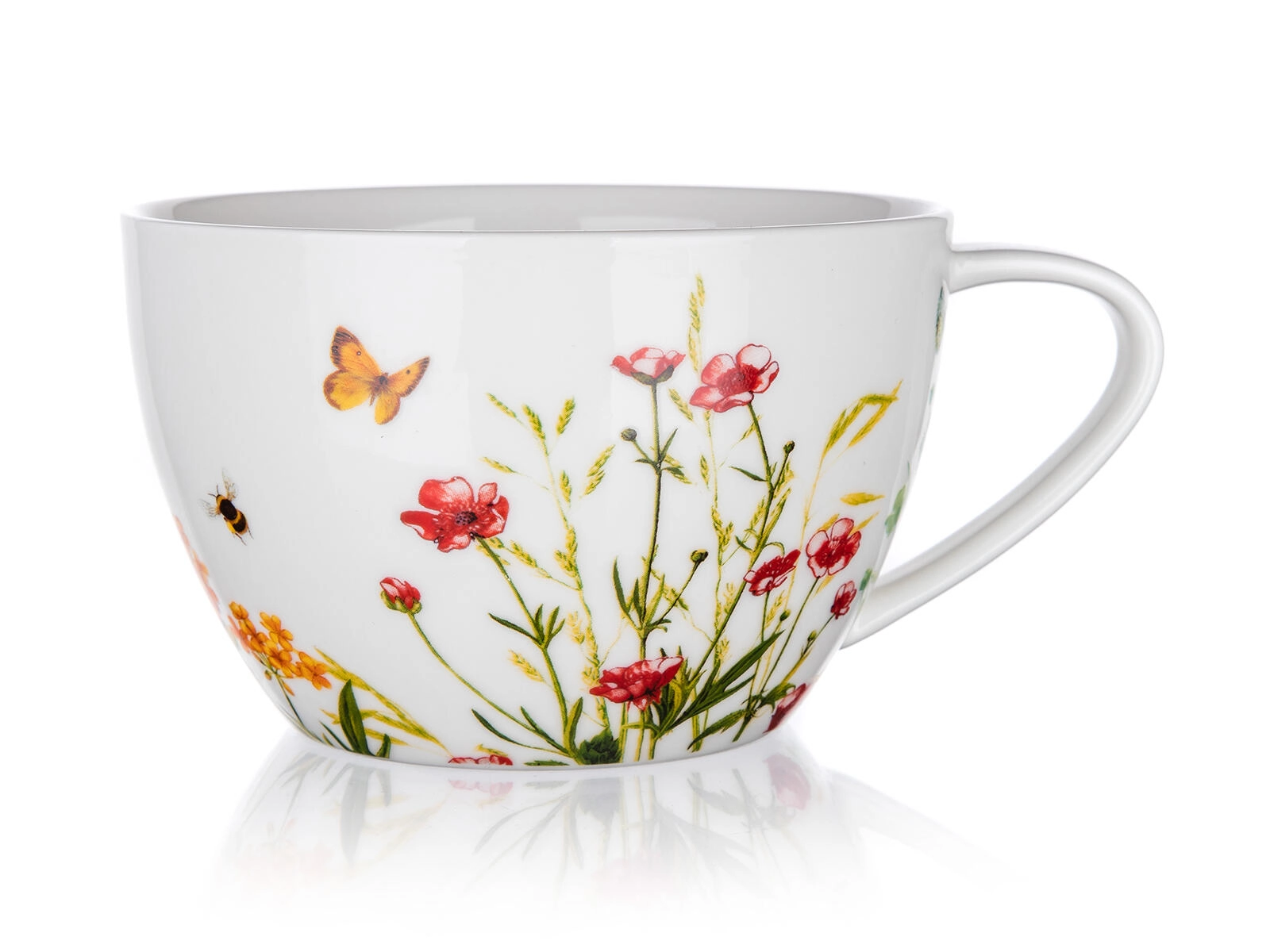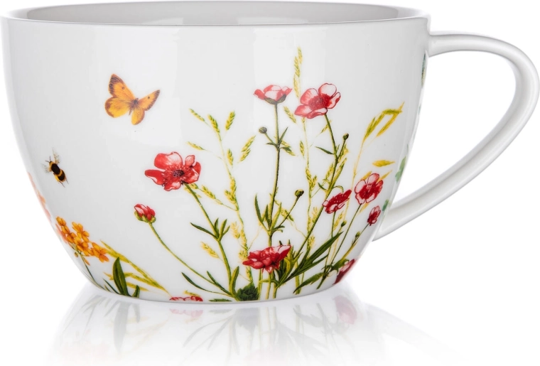 Veľký keramický hrnček Jumbo Meadow (550 ml) je ideálny na každodenné chvíle pohody. Prírodný kvetinový motív s motýlikom a včielkou dodá servírovaniu jedinečný šarm a ľahko sa kombinuje s ďalšími kúskami v rovnakom dekore.