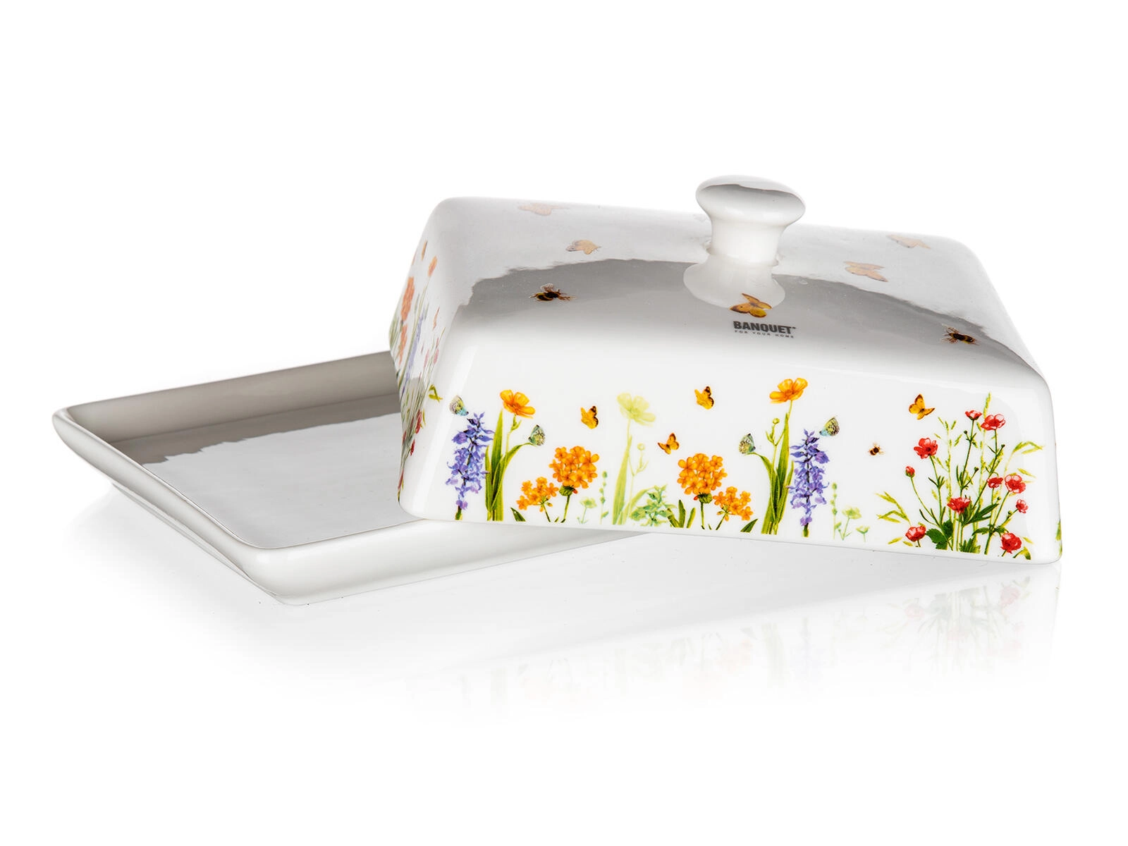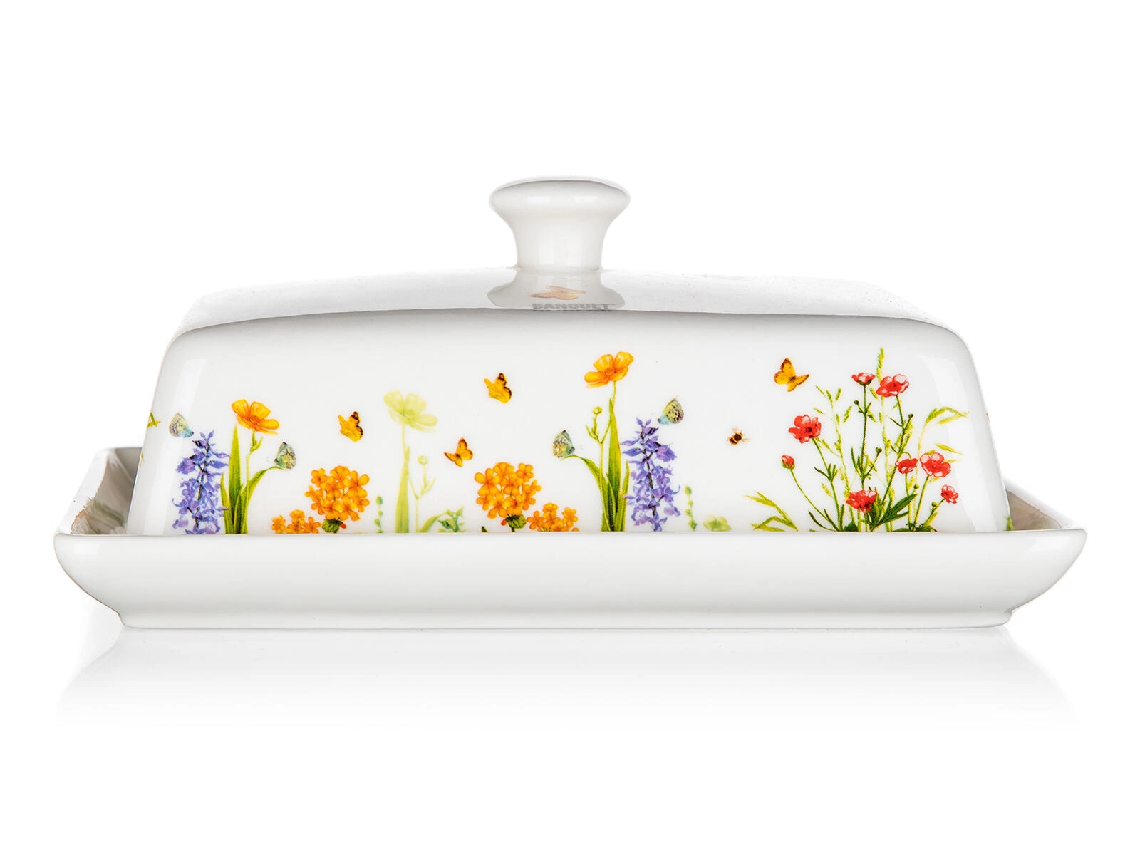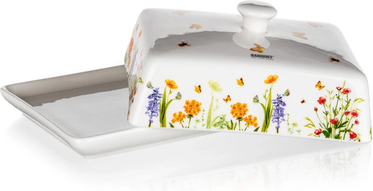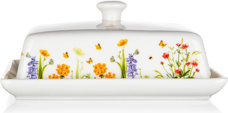 Štýlová maselnička Meadow spája funkčnosť a dizajn. Pevná keramika s hladkou glazúrou sa ľahko čistí, viečko s úchopom umožňuje pohodlné zdvíhanie a prenášanie. Dekor s kvetmi a motýľmi dodá vašej kuchyni svieži dotyk prírody.