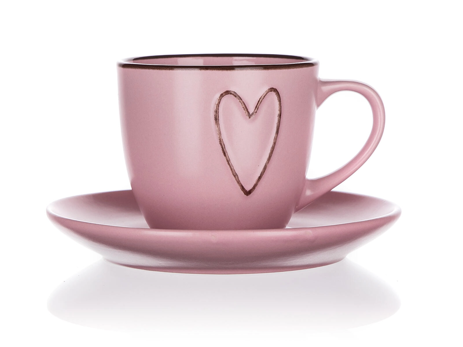 Elegantná šálka s podšálkou s objemom 260 ml v nežnej ružovej farbe s dekorom srdca. Z kvalitnej keramiky, vhodná do mikrovlnnej rúry aj umývačky riadu na každodenné pohodové chvíle s kávou či čajom.