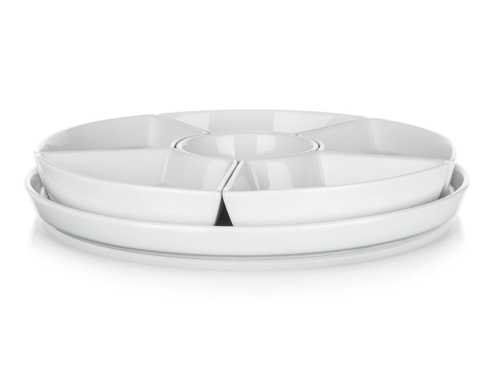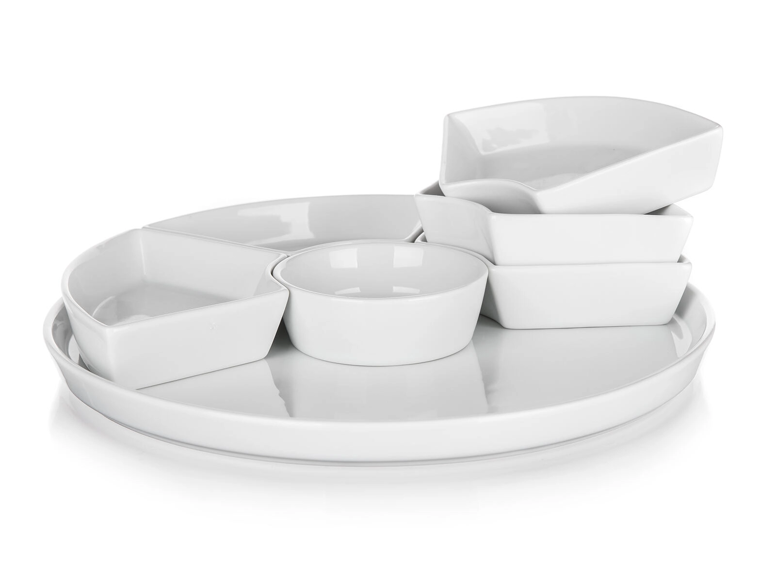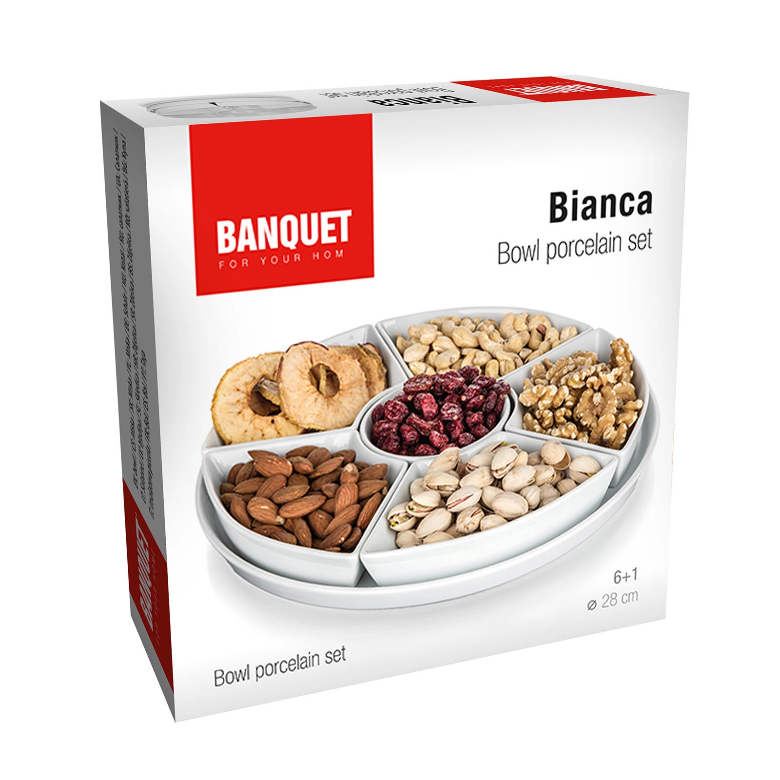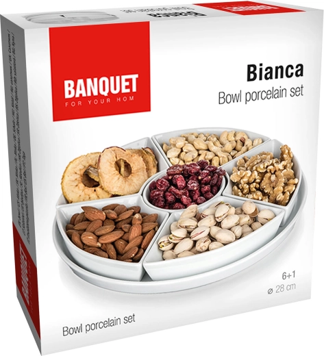 Štýlová okrúhla servírovacia súprava BIANCA z bieleho porcelánu kombinuje čistý dizajn a praktickosť. Centrálne tácke dopĺňa šesť tvarovo ladiacich mištičiek, ktoré umožňujú oddelené podávanie rôznych pochúťok – od sušeného ovocia a orieškov cez zeleninu až po omáčky a dipy. Vďaka prehľadnému rozdeleniu bude váš stôl vždy upravený a lákavý.