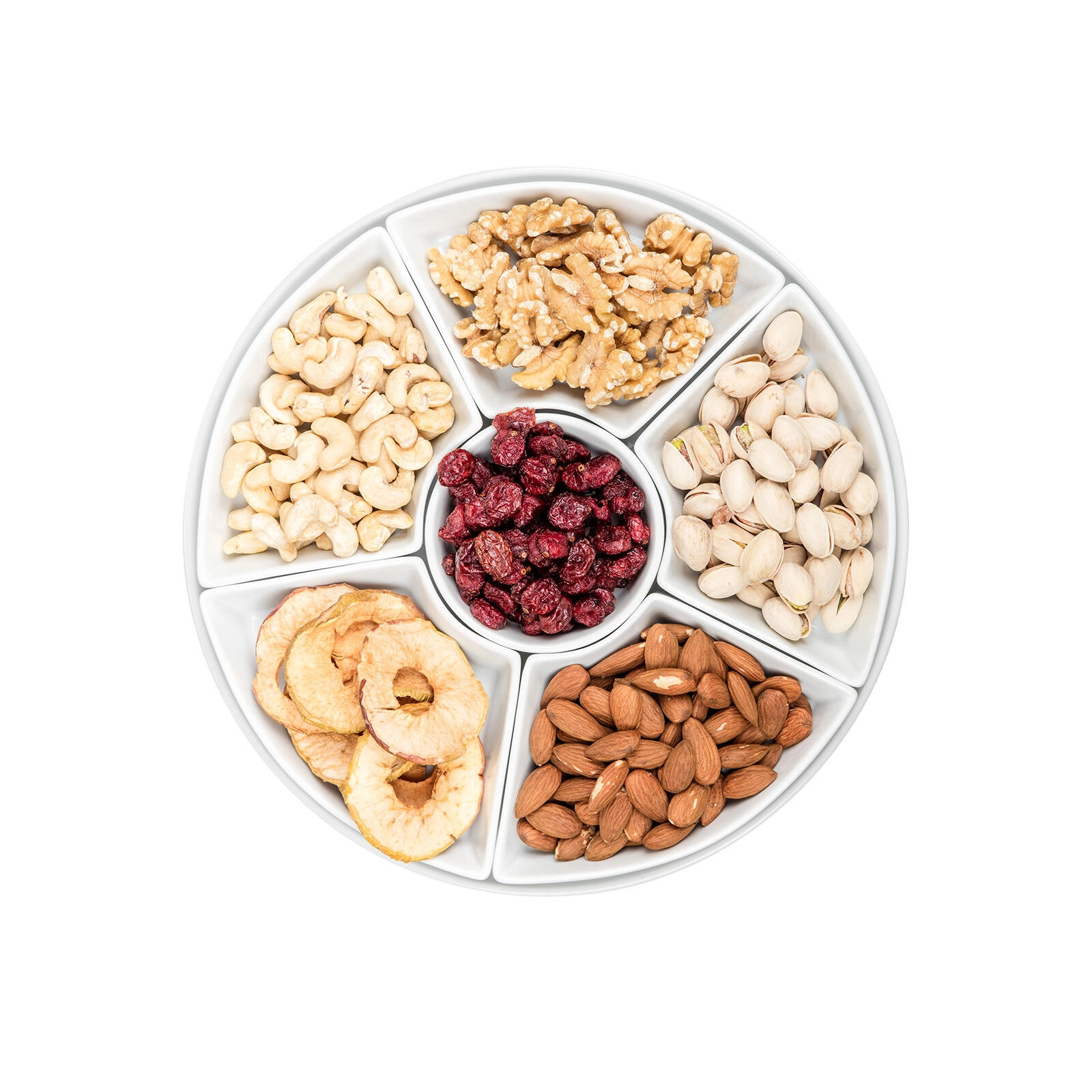 Okrúhly podnos a šesť samostatných mištičiek udrží každý druh pochutín zvlášť – prehľadné servírovanie bez miešania chutí.
