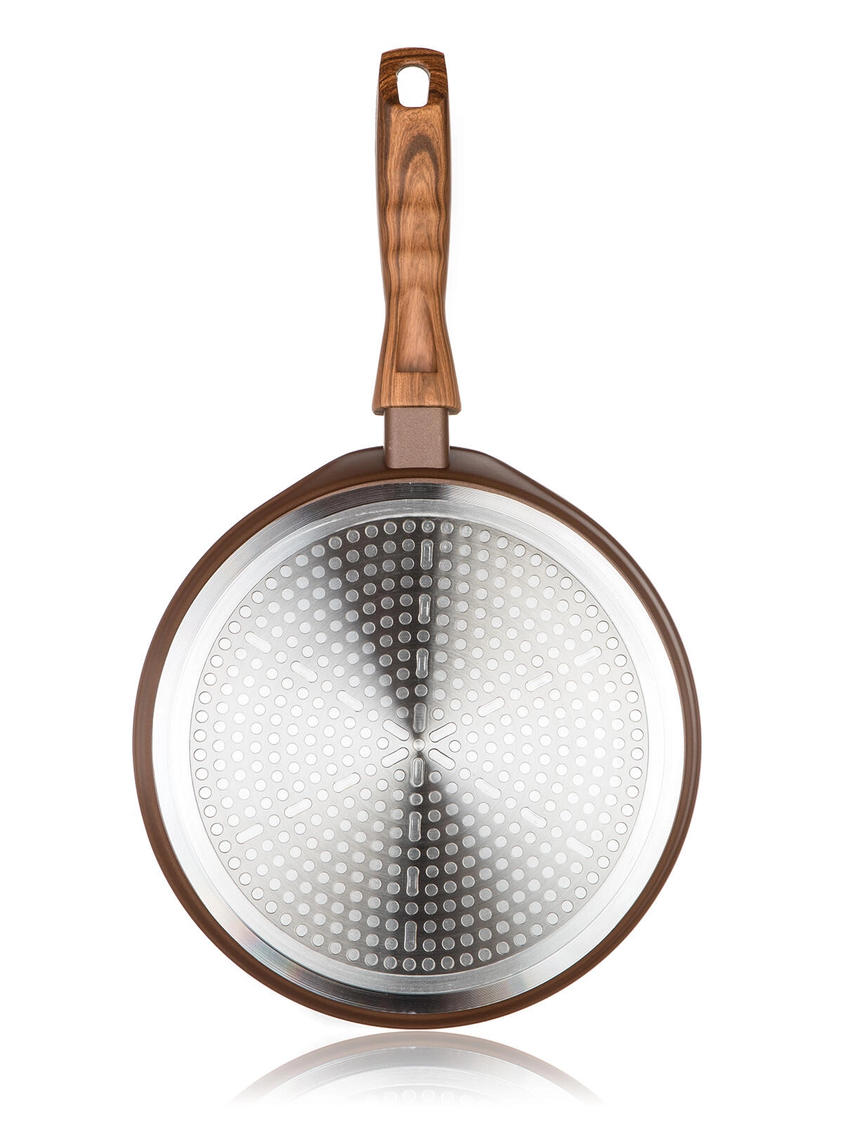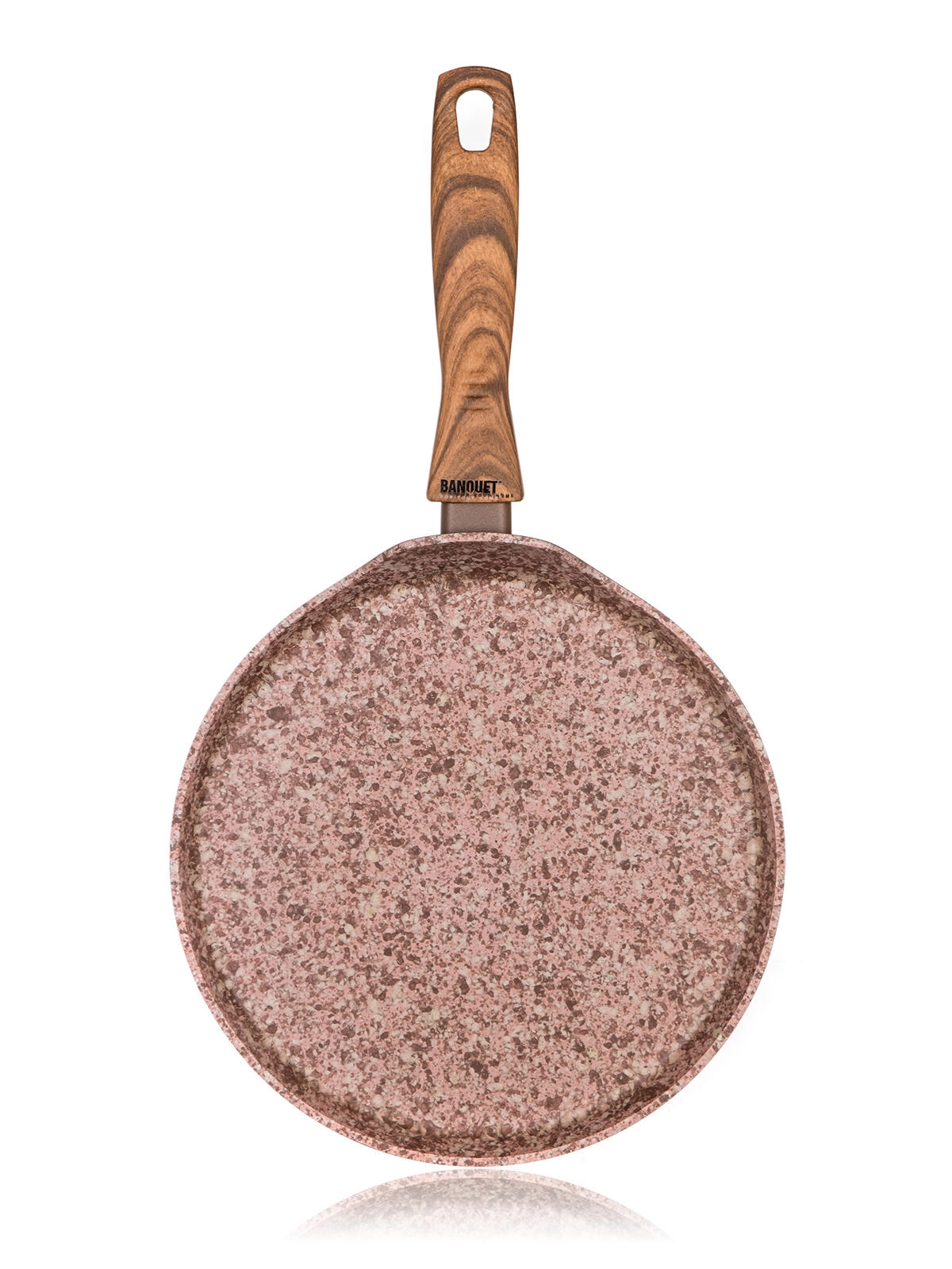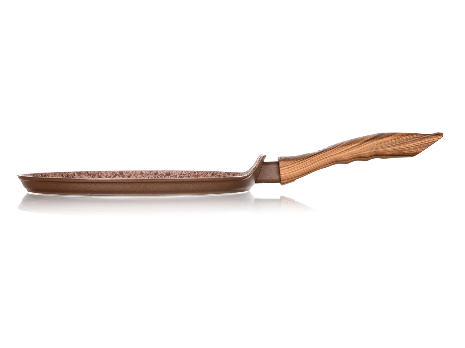 Panvica na palacinky Smart Stone Brick s priemerom 24 cm je vyrobená z kovaného hliníka pre rýchly a rovnomerný rozvod tepla. Dvojvrstvový neprilnavý povrch v štruktúre riečneho kameňa zabezpečuje ľahké uvoľnenie pokrmov a jednoduché čistenie. Elegantný tehlový dekor s mramorovým efektom dopĺňa ergonomická bakelitová rukoväť s povrchovou úpravou soft touch v dizajne prírodného dreva.