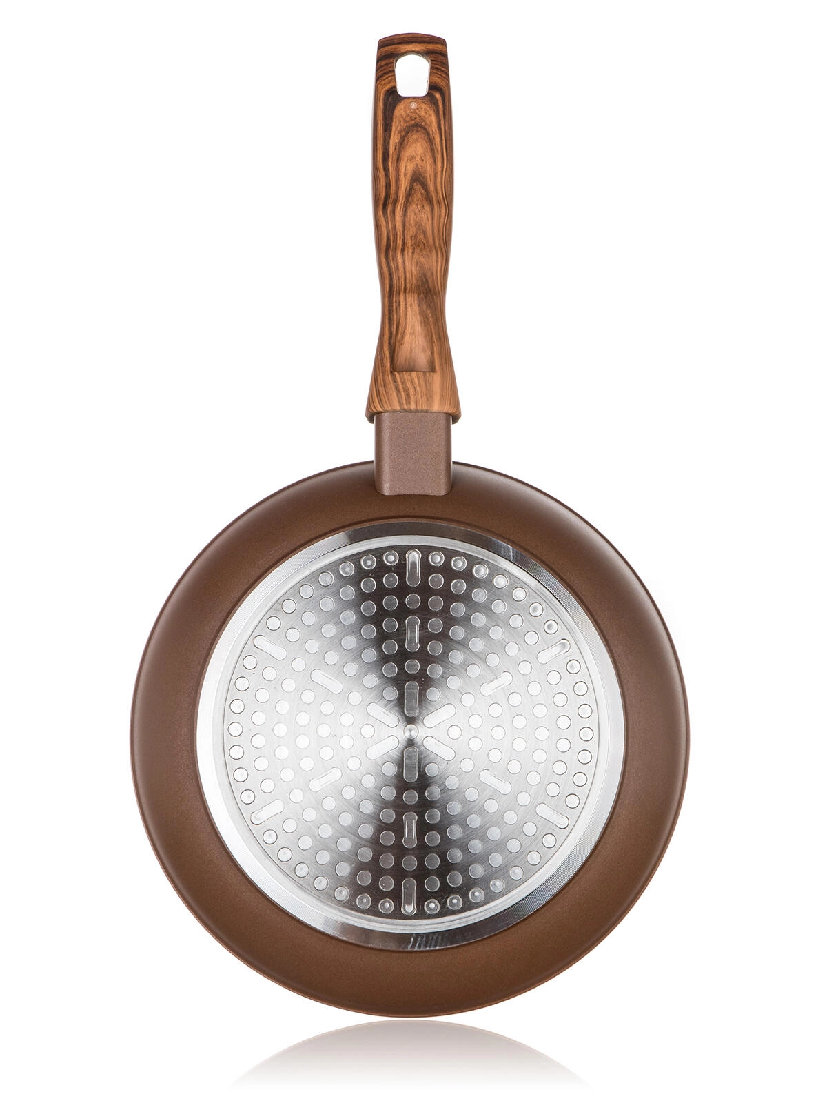 Vďaka plne indukčnému dnu je panvica kompatibilná so všetkými varnými doskami – elektrina, plyn, sklokeramika aj indukcia. Ergonomická bakelitová rukoväť so soft touch úpravou v imitácii dreva dobre padne do ruky a zostáva chladná pri varení.