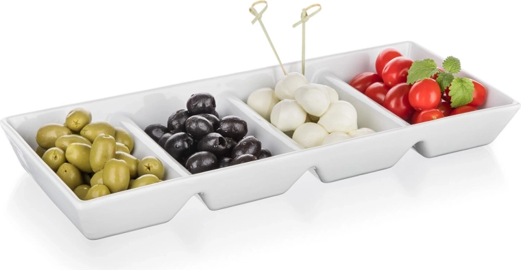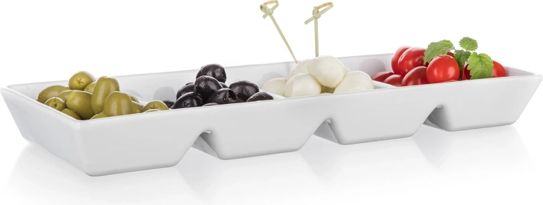 Štyri oddiely udržia pochutiny prehľadne oddelené – ideálne na olivy, mozzarellu, paradajky, oriešky či dipy. Žiadne miešanie chutí, čistá prezentácia.
