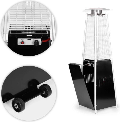 Ovládací panel umožňuje plynulé nastavenie výkonu podľa počasia. Elektrické zapaľovanie (1× AAA, nie je súčasťou) uľahčuje štart a energeticky úsporná prevádzka šetrí plyn. Integrované prepravné kolieska a gumové koncovky nôh zjednodušia manipuláciu a chránia podlahu.