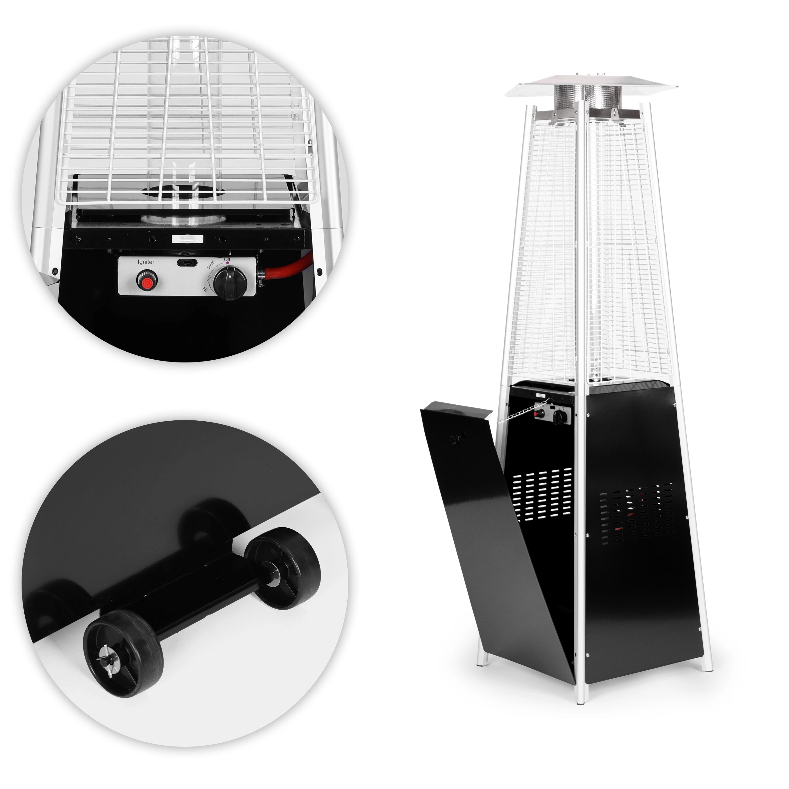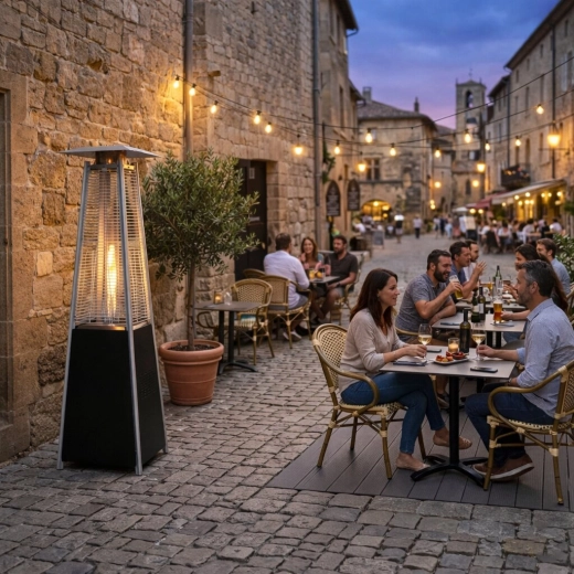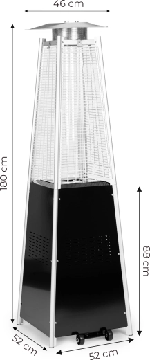 Výkonný horák so skleneným štítom vytvára vysoký, viditeľný plameň a sálavé teplo do všetkých smerov. Ideálny pre terasy, záhrady aj reštauračné terasy.