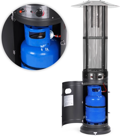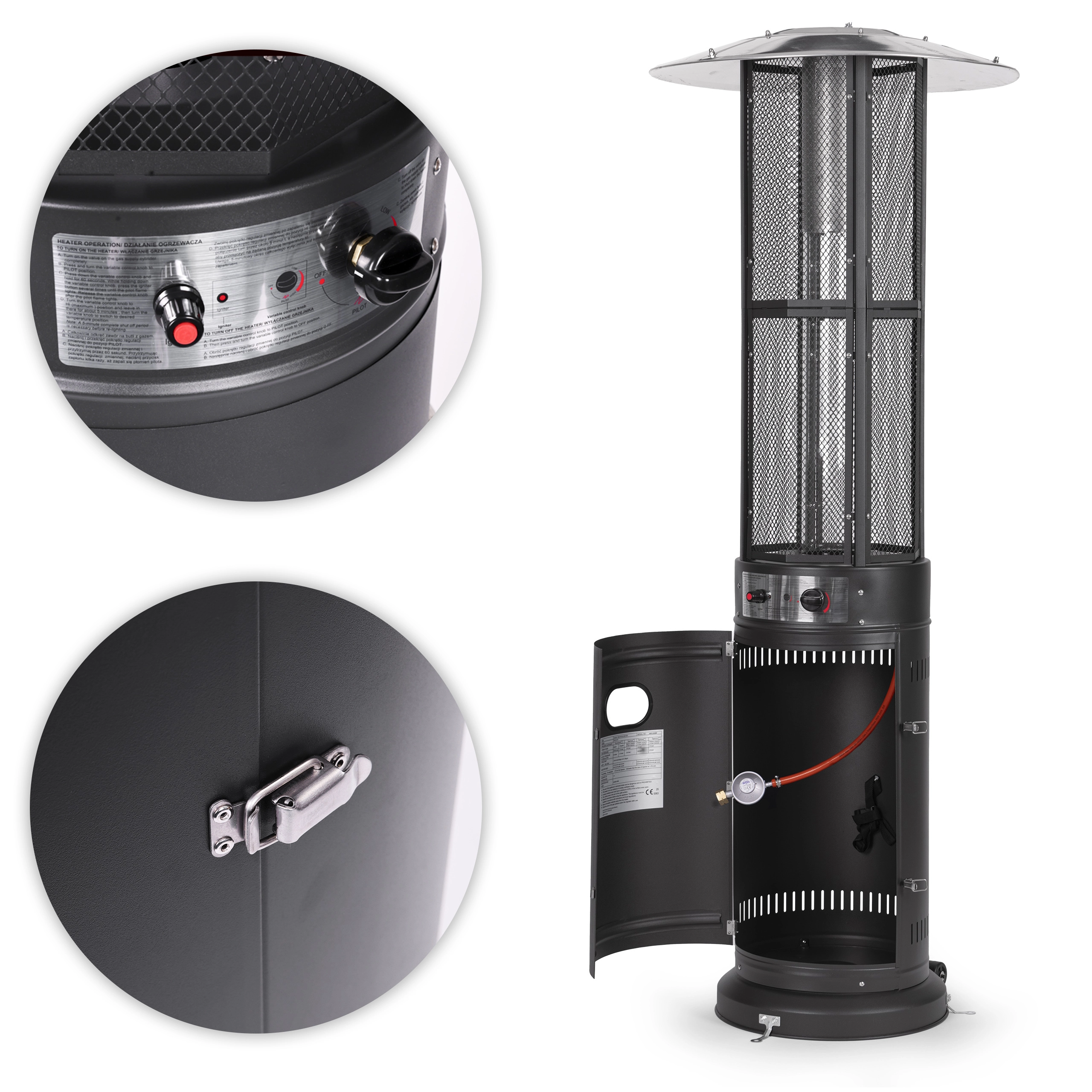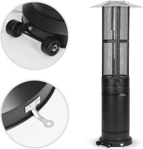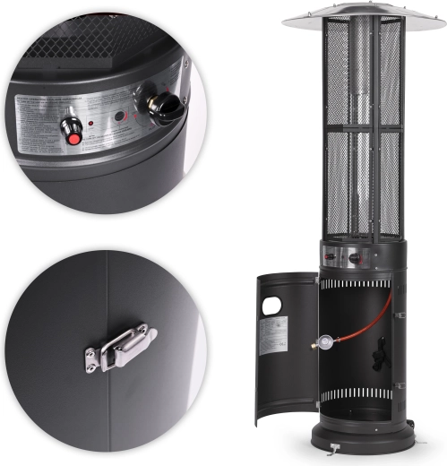 Ovládanie je intuitívne: plynulá regulácia plameňa a elektrické zapaľovanie (1× AAA, nie je súčasťou) umožnia rýchly štart a presné nastavenie intenzity. Uzavierateľná priehradka pre plynovú fľašu (až 11 kg) s magnetickými dvierkami a fixačným popruhom zvyšuje bezpečie a estetiku. Kolieska uľahčujú presun a pre stále inštalácie sú k dispozícii kotviace úchyty v základni.