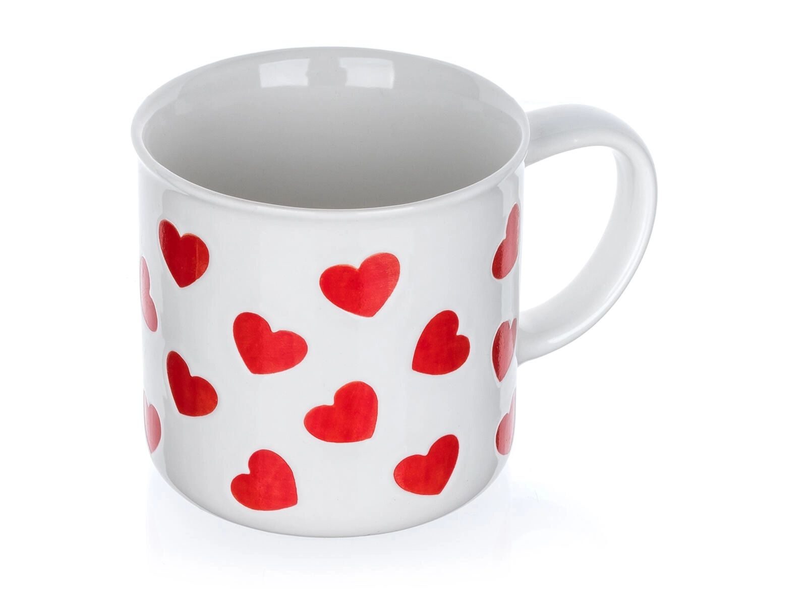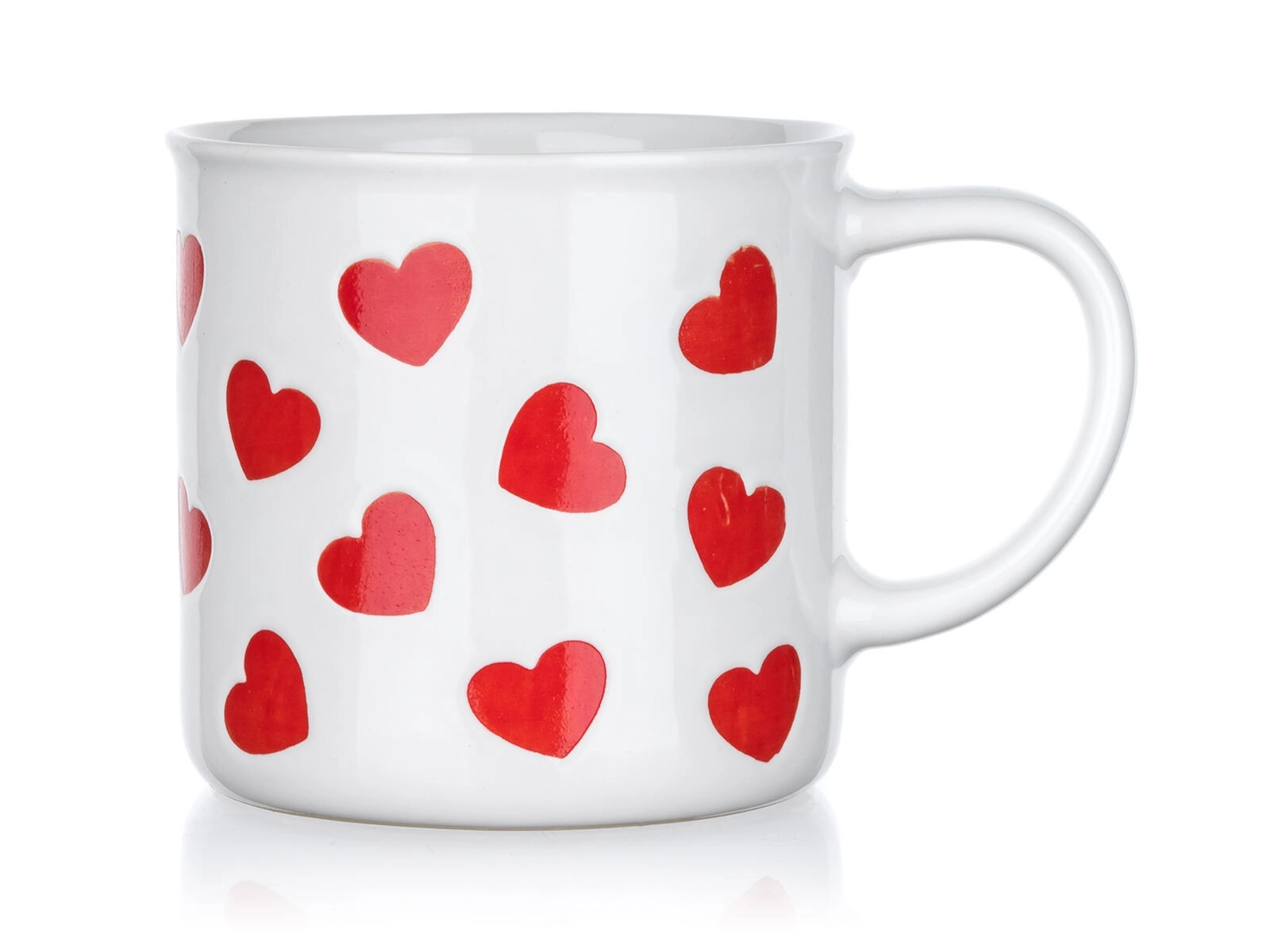 Opakujúci sa motív červených sŕdc na bielej glazúre vytvára hravý a láskavý vzhľad – perfektný pre radosť sebe aj ako milý darček.