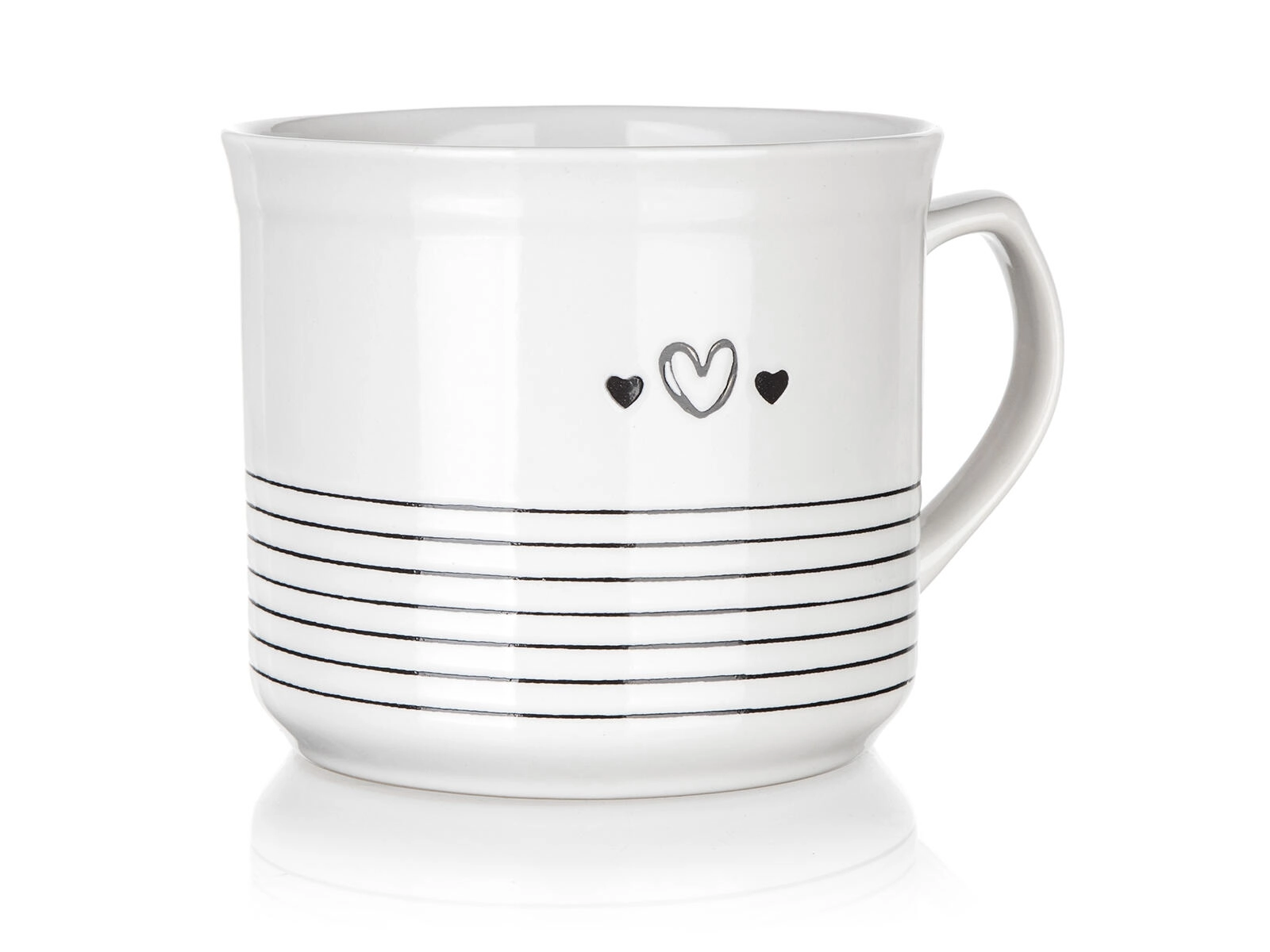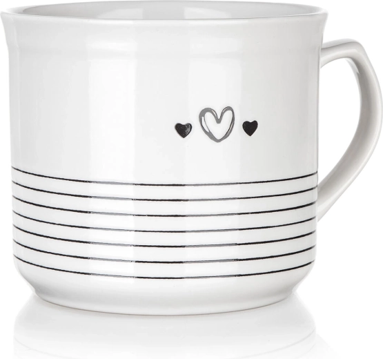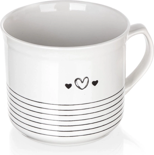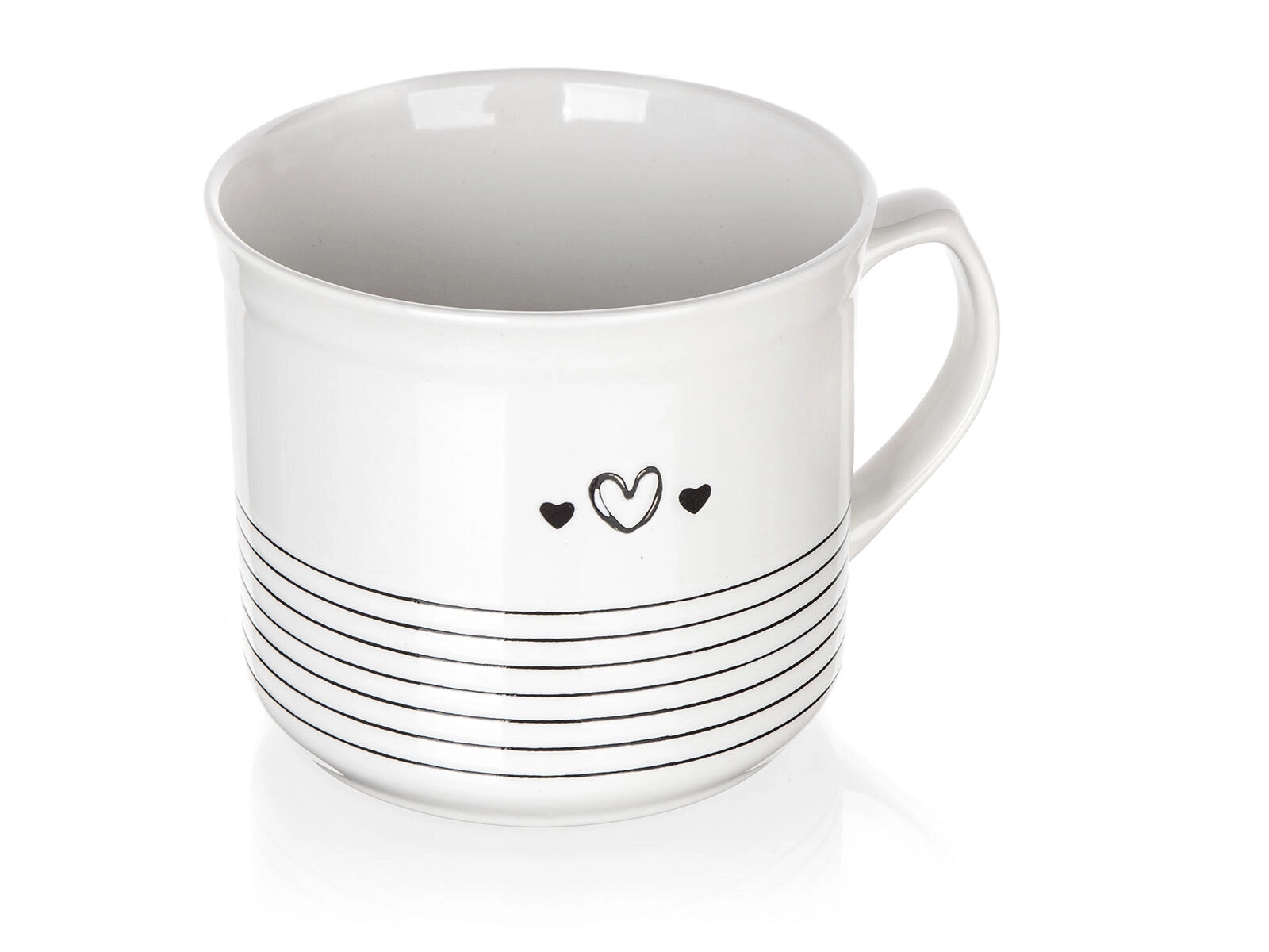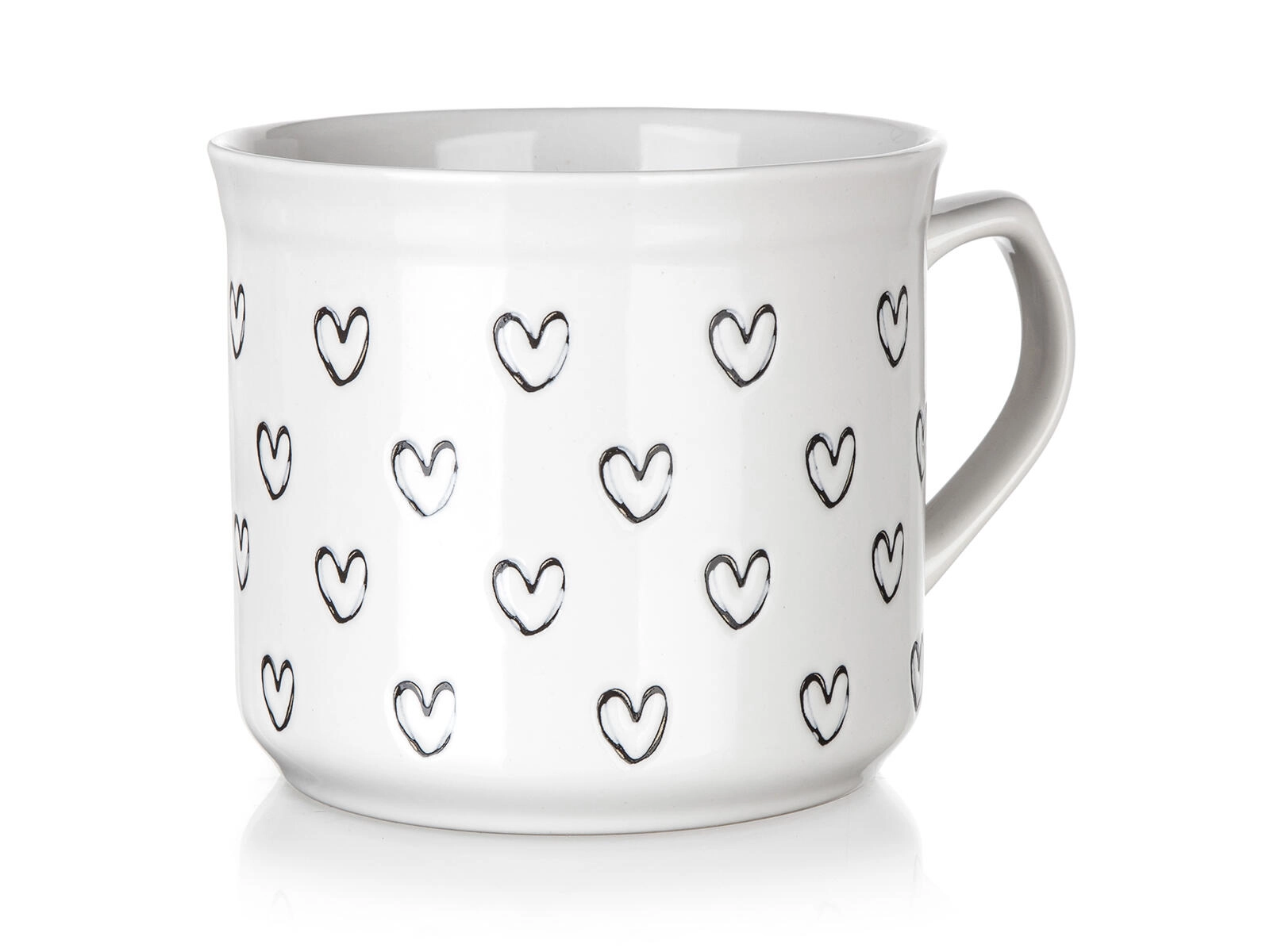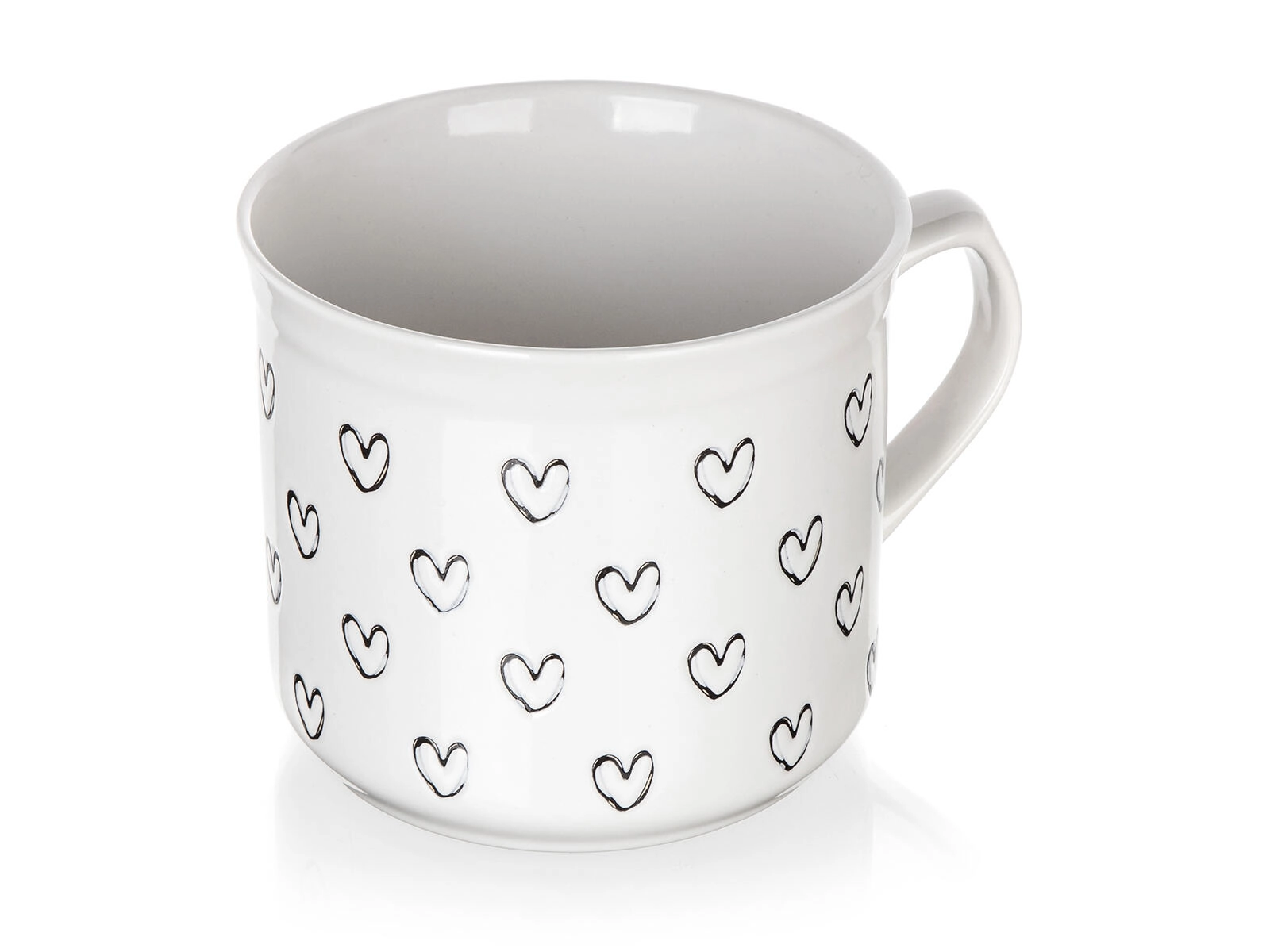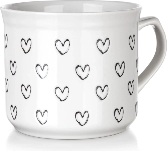 Užite si svoje obľúbené horúce nápoje so štýlom s veľkým keramickým hrnčekom s perokresbou srdiečok. Vďaka objemu 660 ml je perfektný na dlhé ranné kafe aj poctivý bylinkový čaj. Lesklá glazúra a čistý biely základ s čiernymi detailmi dodajú vašej kuchyni nadčasovú eleganciu.