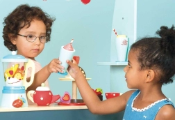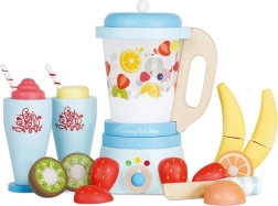 Tento štýlový drevený set z kolekcie Honeybake premení každú detskú kuchynku na smoothie bar. Deti môžu bezpečne „krájať“ ovocie na suchý zips, naplniť nádobu mixéra a servírovať lahodné nápoje do dvoch kelímkov so slamkou. Realistické detaily podporujú rolové hry, rozvoj jemnej motoriky a kognitívnych zručností.