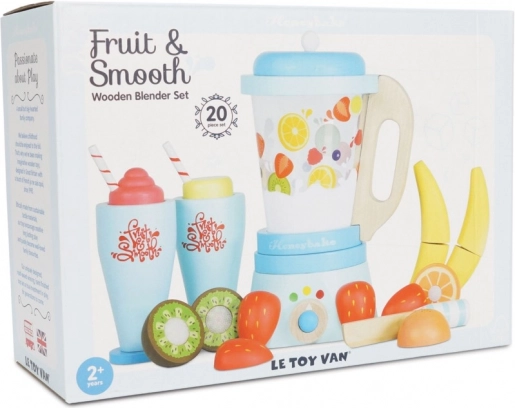 Namixujte deťom zdravú porciu zábavy s dreveným smoothie mixérom LE TOY VAN. Sada obsahuje klasický mixér s odnímateľnou nádobou, 6 kusov krájateľného ovocia na suchý zips, drevený nožík a 2 poháre so slamkami. Vyrobené z FSC certifikovaného dreva, ručne domaľované netoxickými farbami na vodnej báze a ocenené za kvalitu a hernú hodnotu.