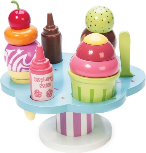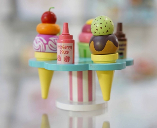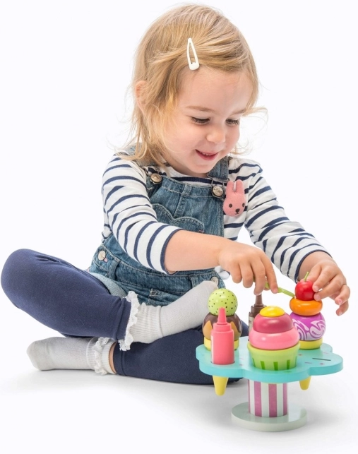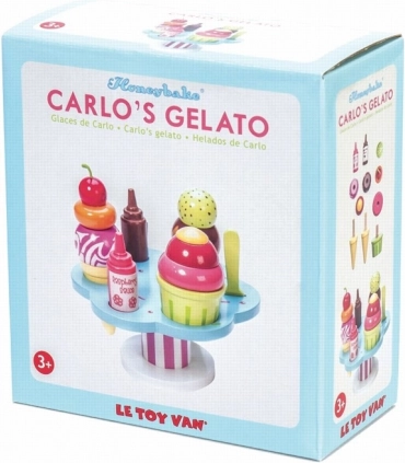 Herný set Le Toy Van Carlo’s Gelato prináša deťom nekonečnú porciu zábavy a fantázie. Obsahuje kornútky aj kelímok, odnímateľné kopčeky, dve omáčky a posýpky, nechýba ani lyžička. Je vyrobený z udržateľného FSC dreva, je ručne domalovaný netoxickými farbami na vodnej báze a podporuje jemnú motoriku, kognitívne zručnosti aj hru na role.