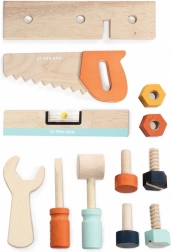 Pílka, kladivo, skrutkovač, kľúč, vodováha, skrutky, vruty, klince a doštička – príslušenstvo presne padnúce do detských rúk.