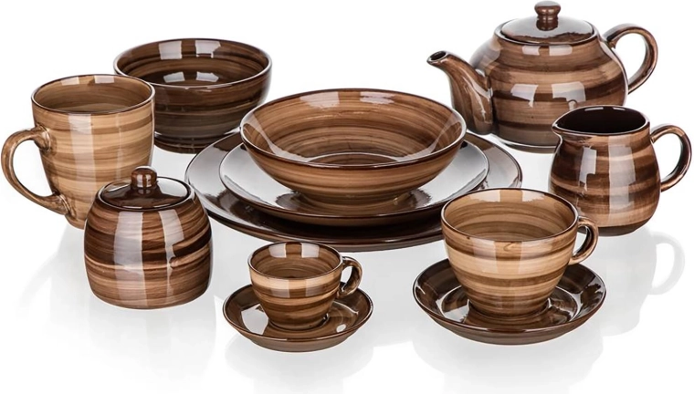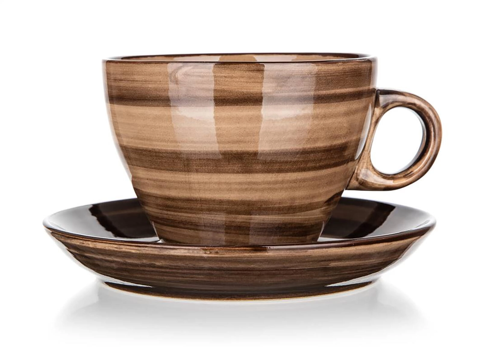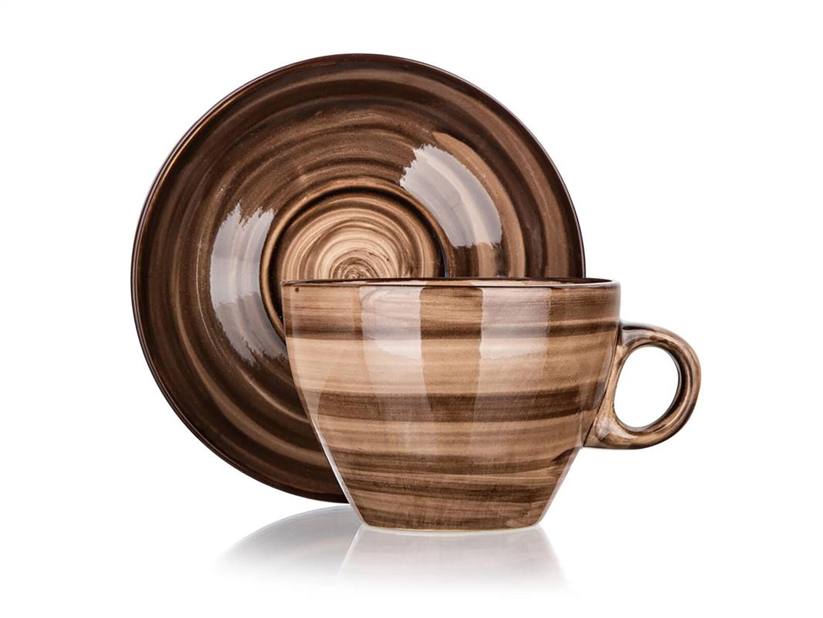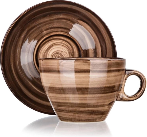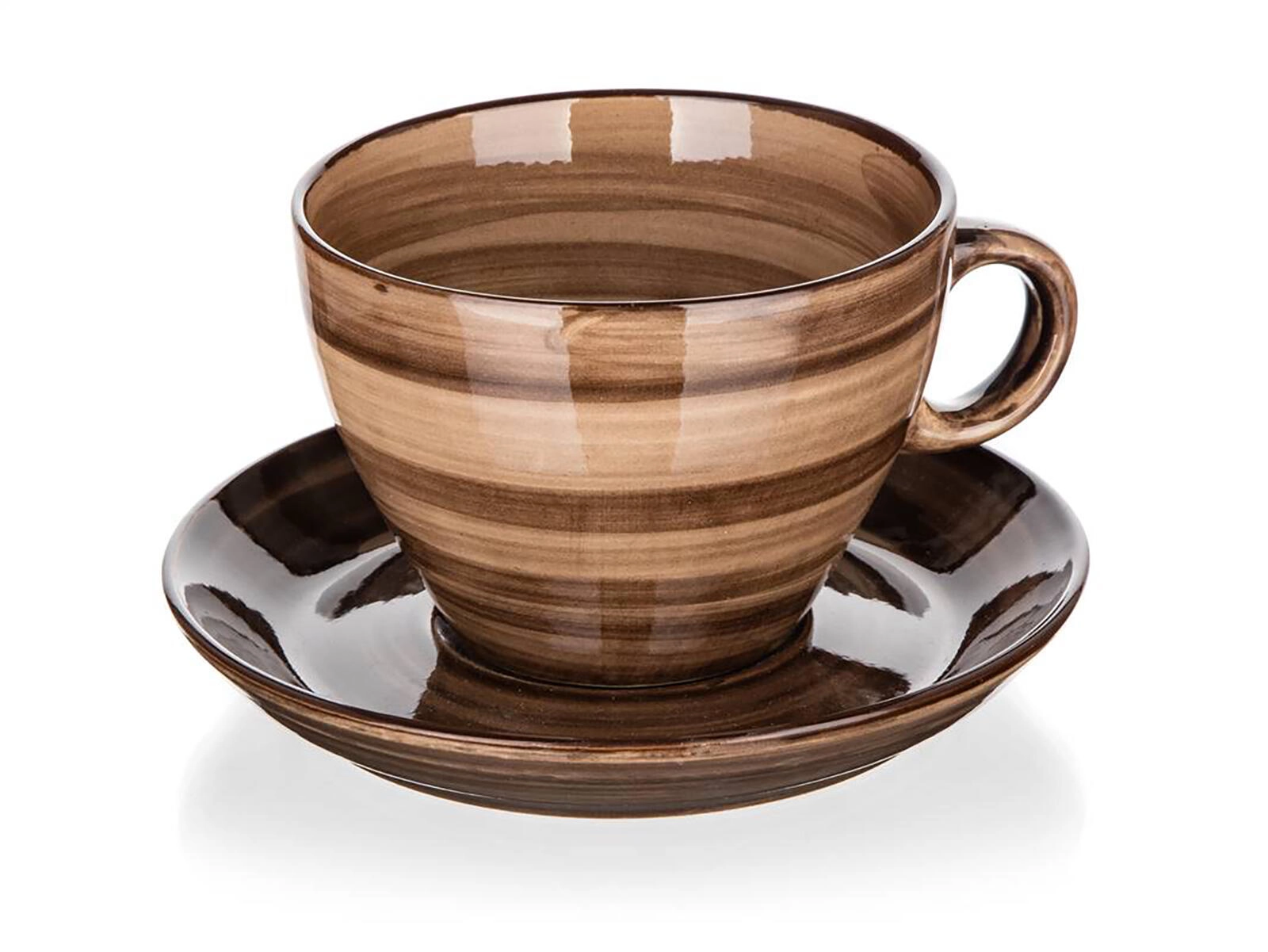 Lesklá, viacfarebná hnedá glazúra s decentnými prúžkami dodáva šálke aj podšálke nadčasový vzhľad a ľahko sa kombinuje s ďalším riadom.