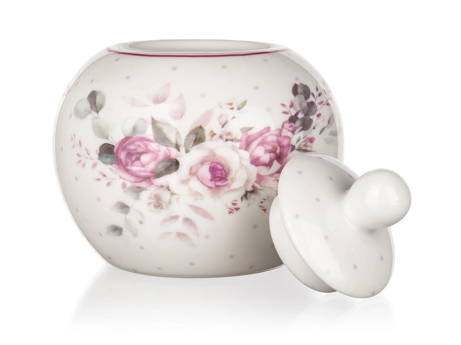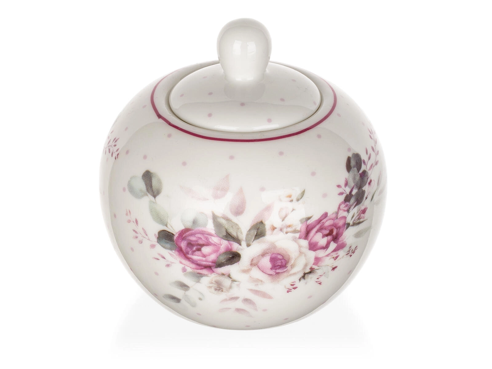 Vdýchnite svojmu stolovaniu jemnú eleganciu s cukorničkou ROSE. Biely keramický základ zdobia pôvabné ružové kvety a decentné bodky, ktoré z nej robia štýlový doplnok kuchyne aj jedálne. Vďaka objemu 280 ml pohodlne uskladní kryštálový aj kockový cukor.