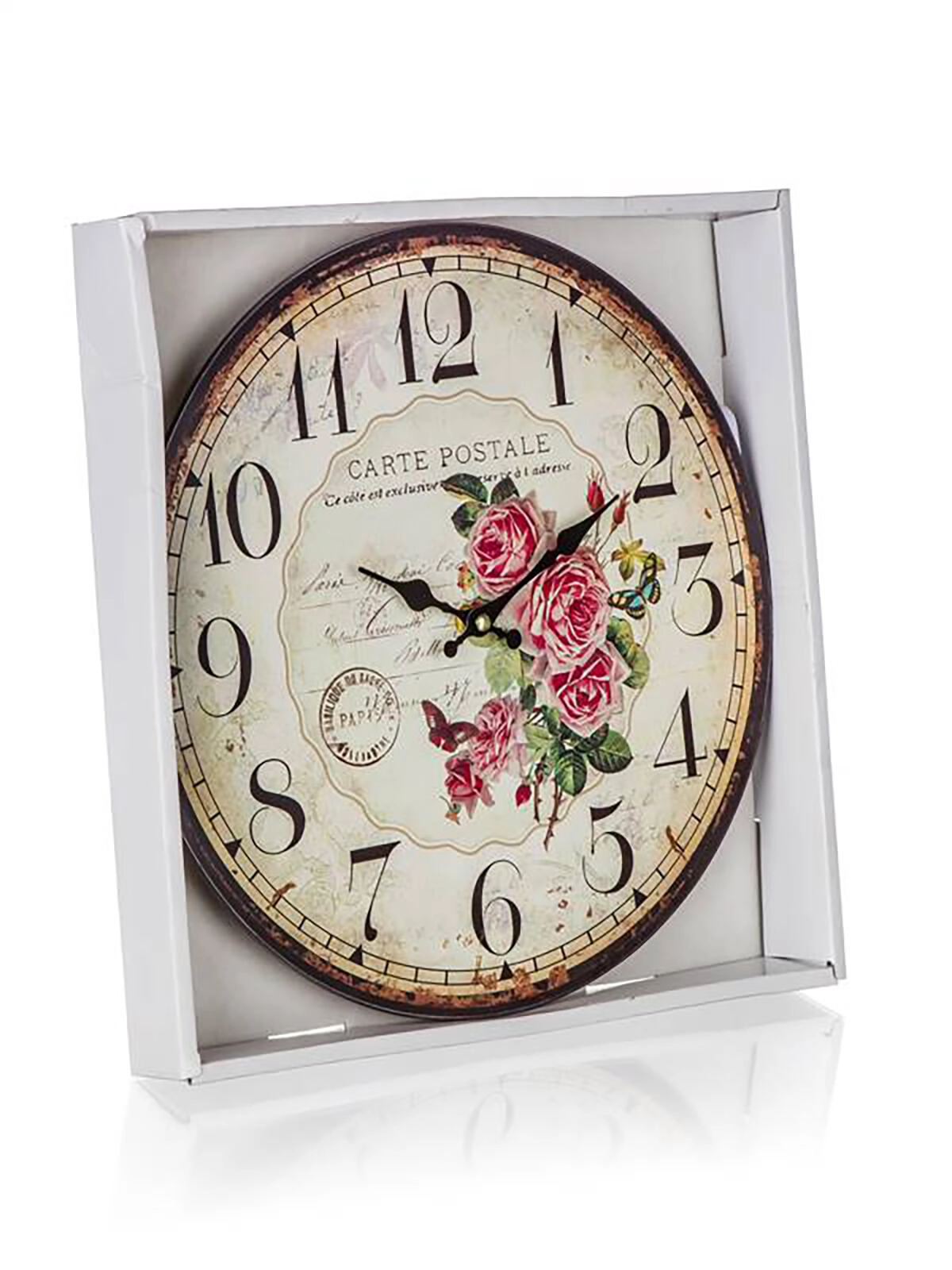 Štýlové nástenné hodiny s priemerom 34 cm v dizajne CARTE POSTALE dodajú vášmu interiéru šarm starých pohľadníc. Tichý chod, čitateľný ciferník a jednoduchá inštalácia z nich robia praktickú aj dekoratívnu voľbu do obývačky, spálne aj štýlovej kuchyne.