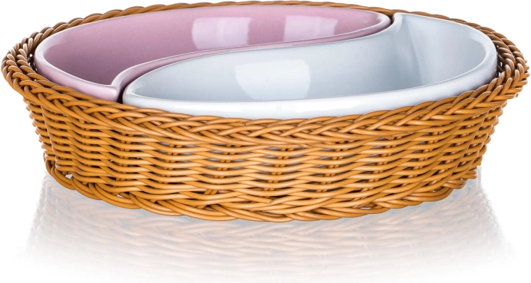 Misky sú navrhnuté v tvare yin‑yang, takže do nich ľahko oddelíte dva rôzne druhy pochutín – napríklad olivy a orechy, chipsy a dip alebo ovocie a čokoládové kúsky. Keramika je hygienická, odolná a ľahko sa čistí, prútený košík chráni stôl a dodáva setu dekoratívny vzhľad.