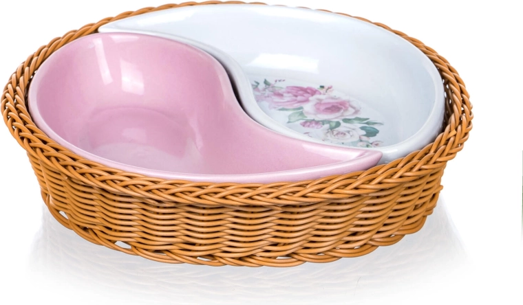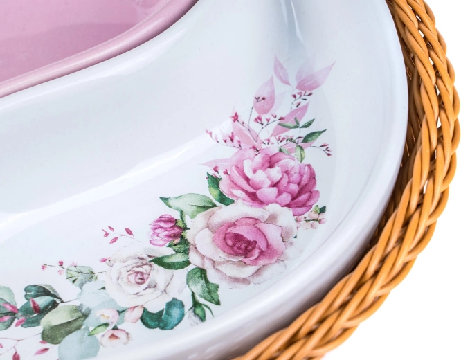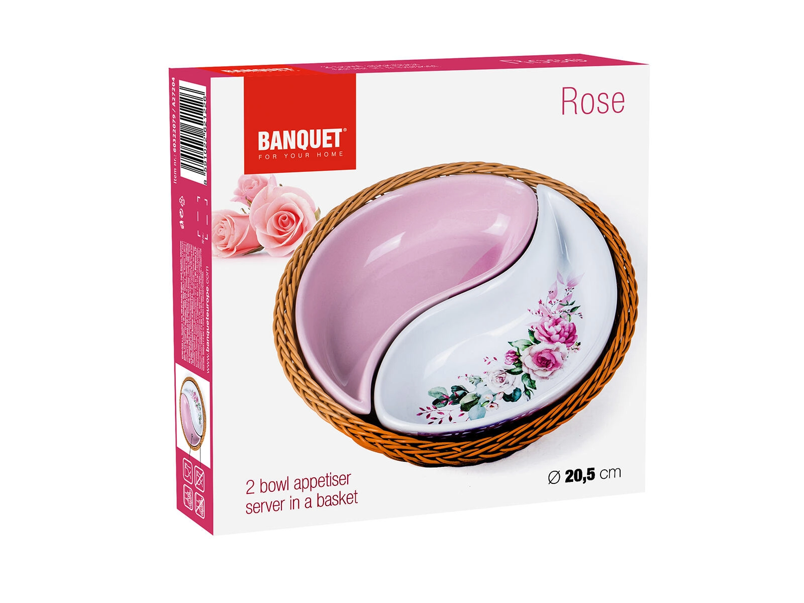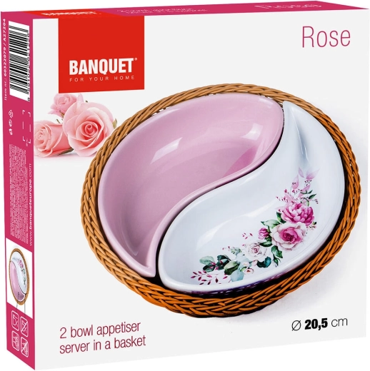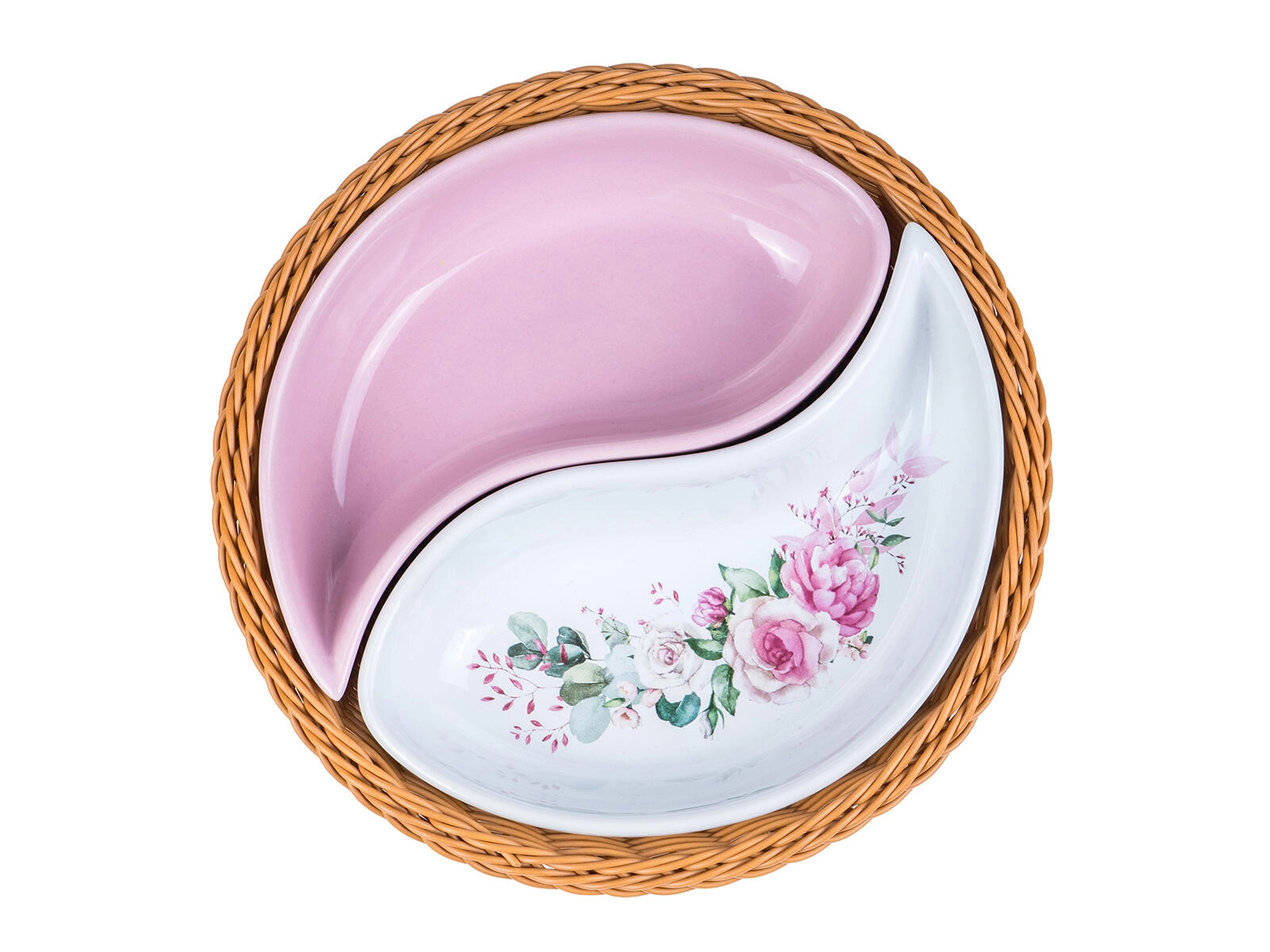 Elegantná dvojdielna sada misiek ROSE v okrúhlom prútenom košíku s priemerom 20,5 cm kombinuje lesklú keramiku v ružovo-bielej glazúre s romantickým kvetinovým dekorom. Ideálna na servírovanie snackov, orechov, dipov či príloh, s praktickým deleným tvarom a jednoduchou údržbou.