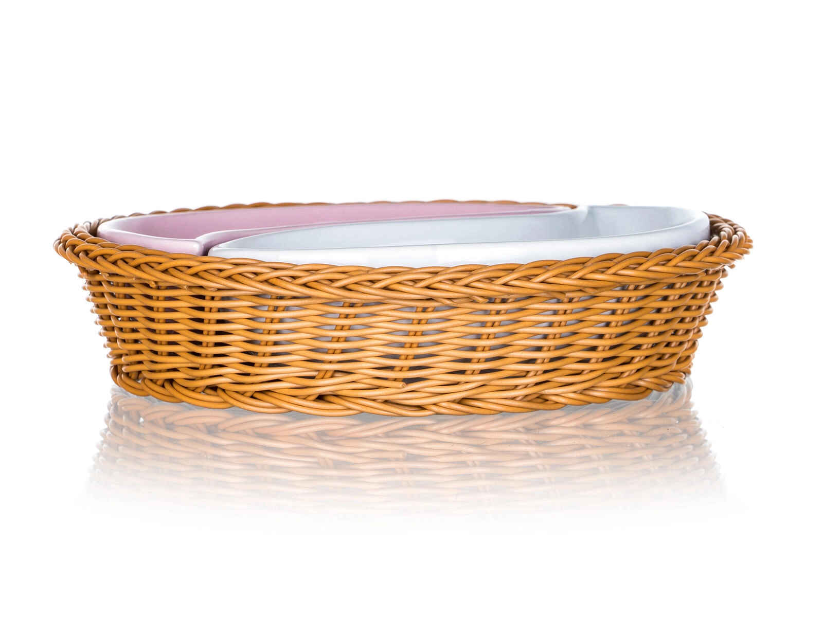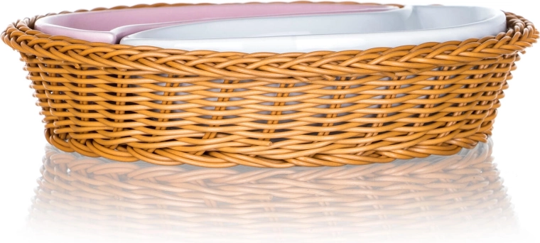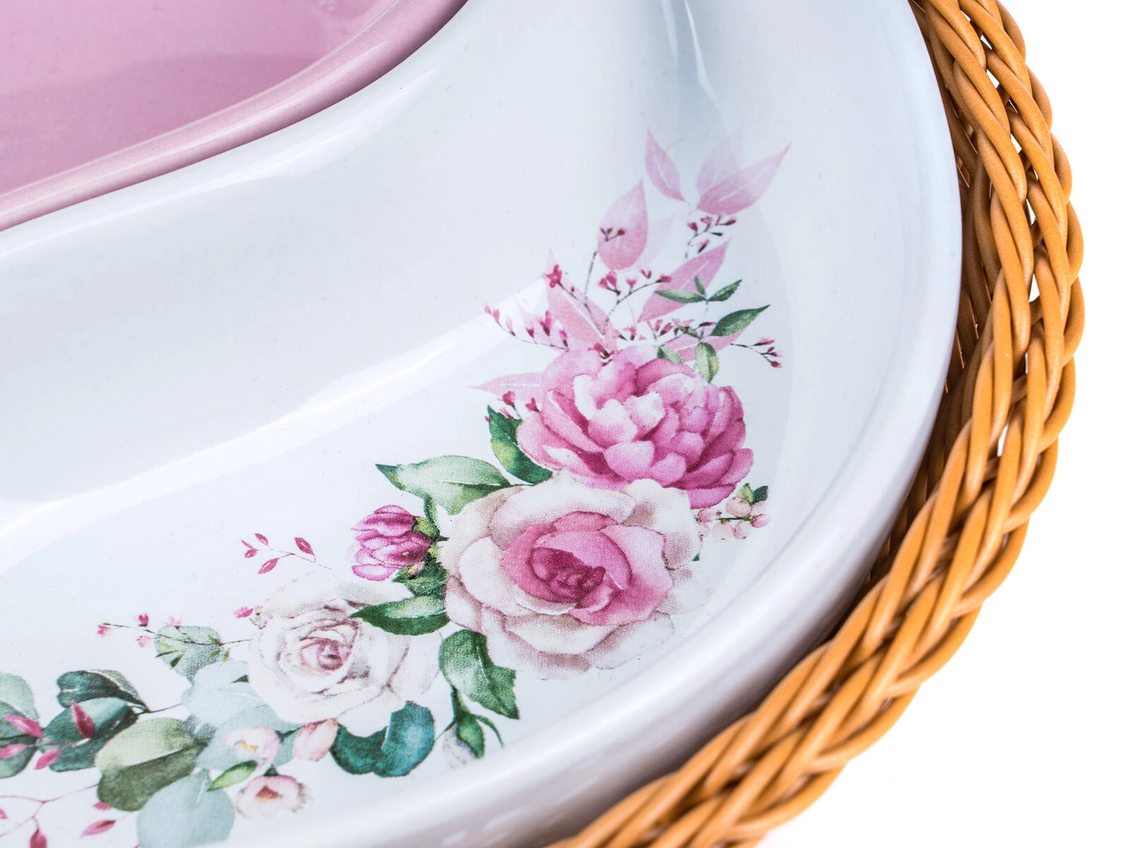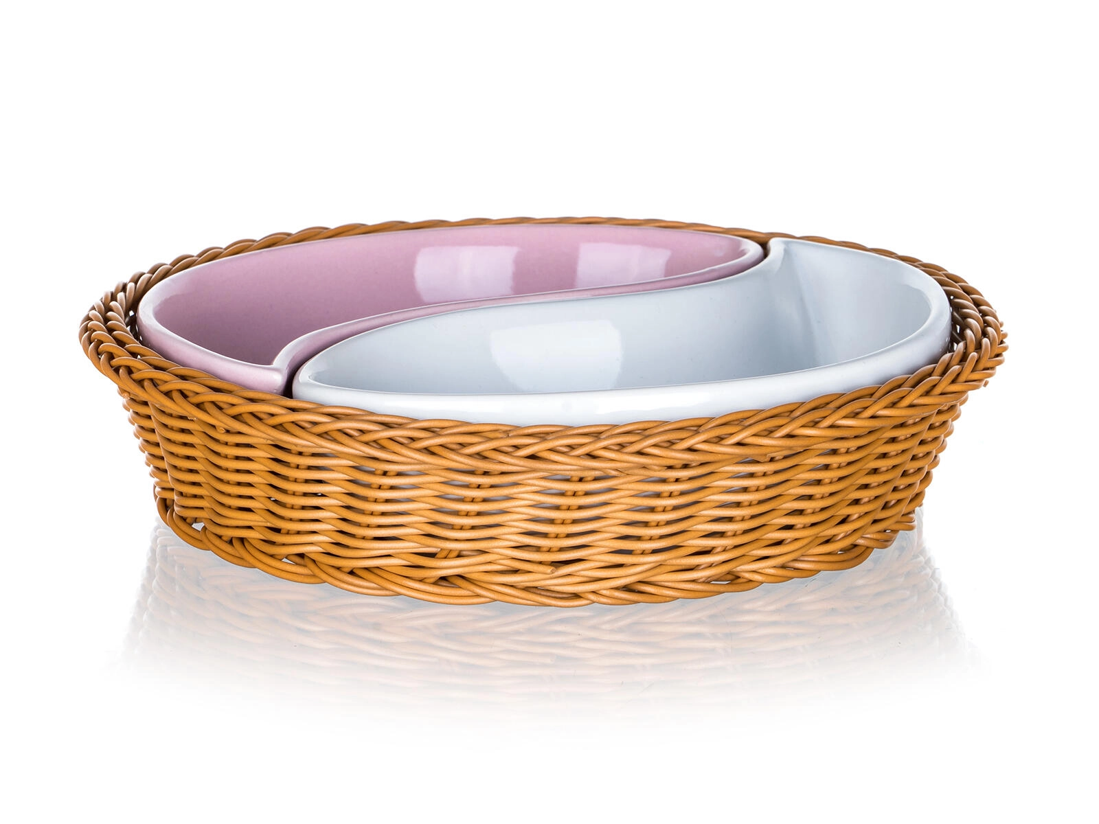 Elegantná dvojdielna sada misiek ROSE v okrúhlom prútenom košíku s priemerom 20,5 cm kombinuje lesklú keramiku v ružovo-bielej glazúre s romantickým kvetinovým dekorom. Ideálna na servírovanie snackov, orechov, dipov či príloh, s praktickým deleným tvarom a jednoduchou údržbou.