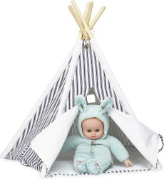 Mini týpí pre bábiky VILAC prináša deťom hravý priestor pre fantáziu a štýlový doplnok do interiéru. Vďaka pevnej drevenej konštrukcii a kvalitnému textilu je stabilné, odolné a pritom veľmi ľahké na zloženie aj prenášanie.