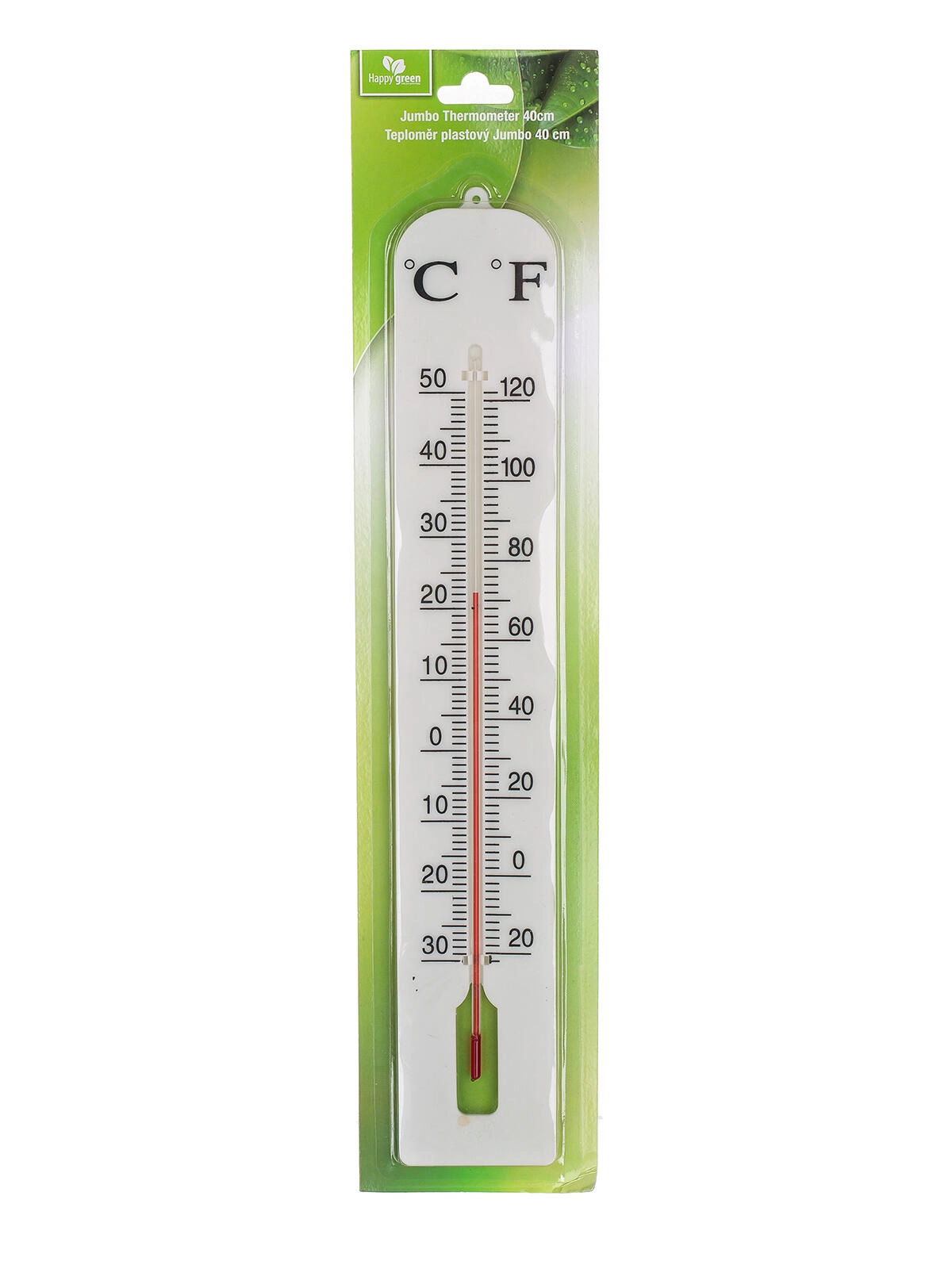 Praktický plastový teplomer HAPPY GREEN Jumbo s dĺžkou 40 cm ponúka jednoduché a rýchle odčítanie teploty. Má dve stupnice v rozsahu -30 až +50 °C a -20 až +120 °F a vďaka očku na zavesenie ho ľahko umiestnite na stenu, balkón či terasu.