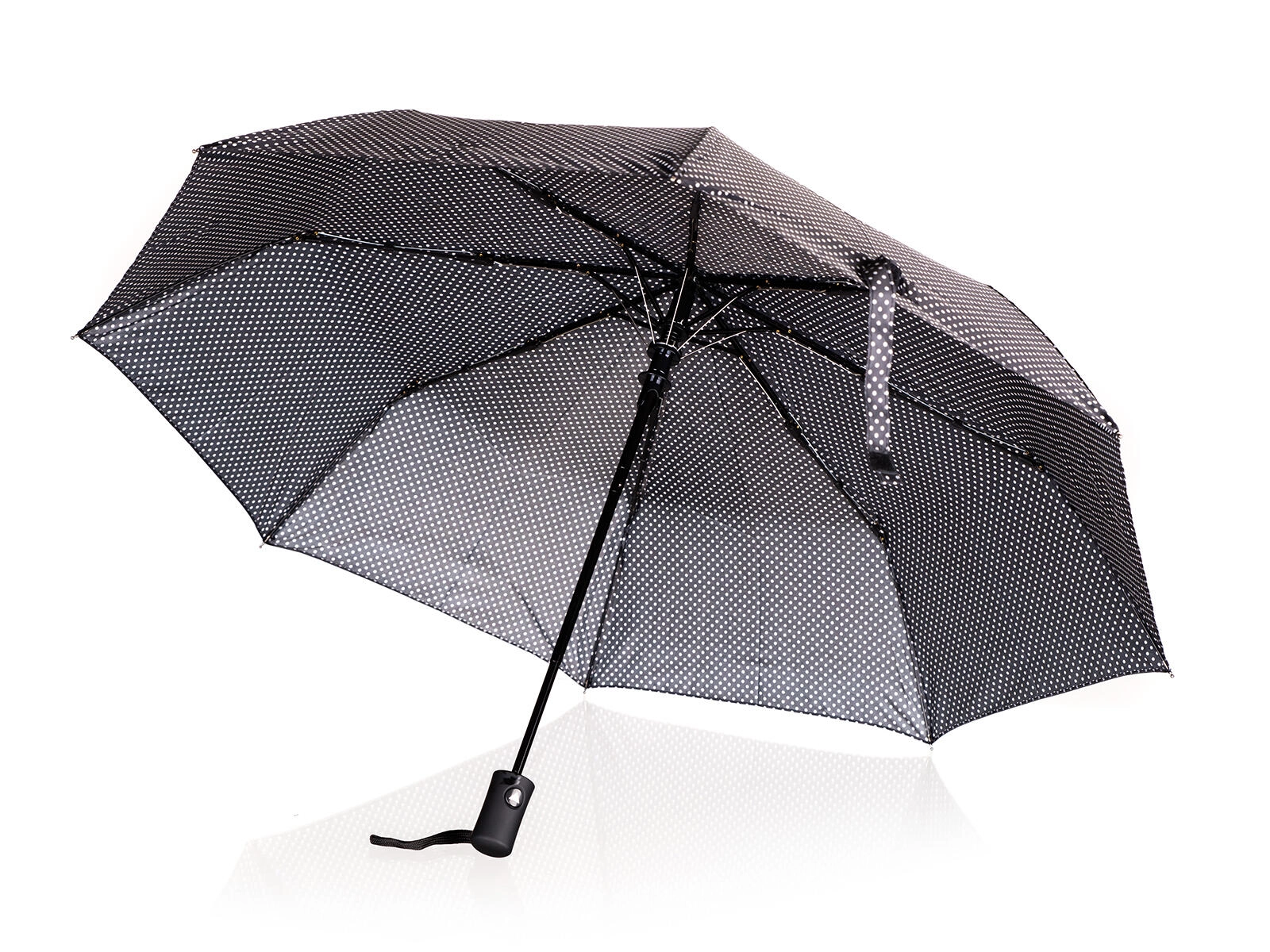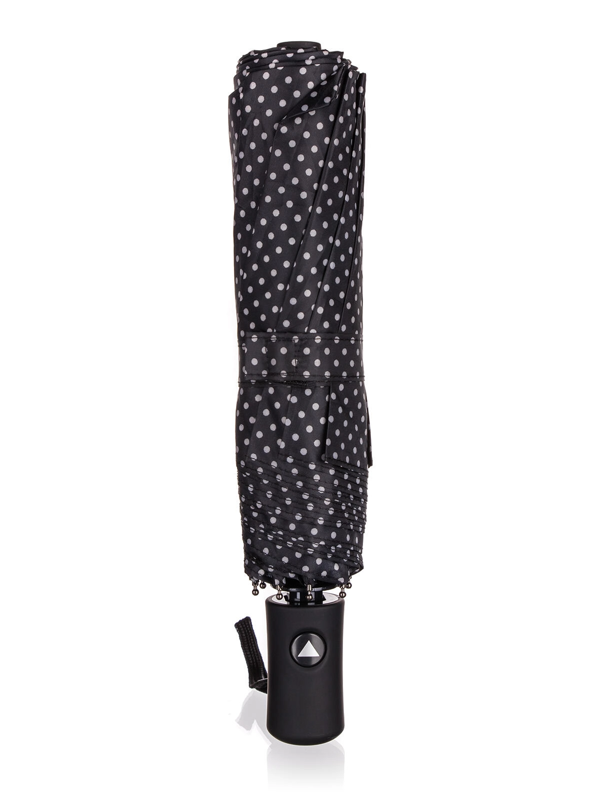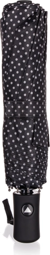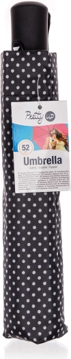 Elegantný skladací dáždnik s priemerom 52 cm v čiernej farbe s bielymi bodkami ponúka spoľahlivú ochranu proti dažďu aj slnku. Vďaka automatickému otváraniu, vetruodolnej konštrukcii a nepremokavému polyesteru je ideálny do kabelky či batohu na každý deň.