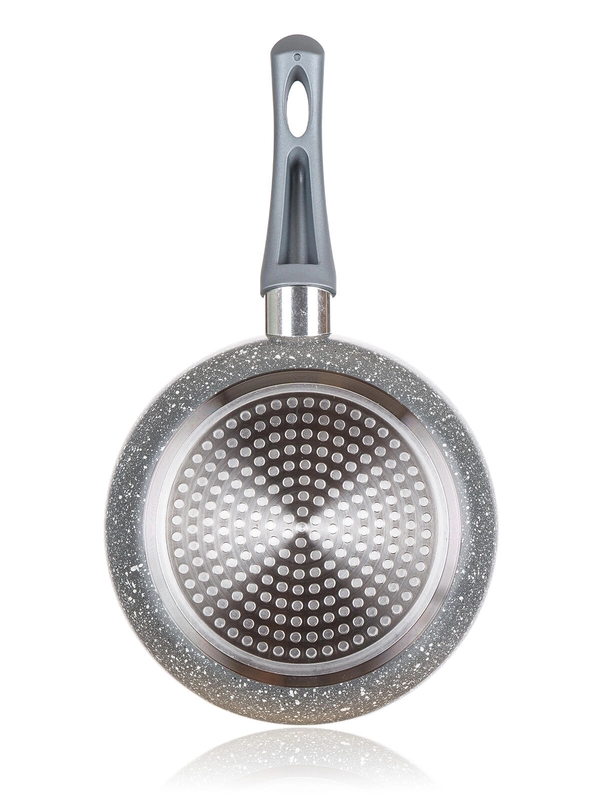 Ergonomická rukoväť poskytuje pohodlný a istý úchop, zatiaľ čo odolný vonkajší žiaruvzdorný nástrek predlžuje životnosť riadu. Štýlový sivý žulový vzhľad sa hodí do každej kuchyne. Panvica je kompatibilná so všetkými typmi varných dosiek, vrátane indukcie.