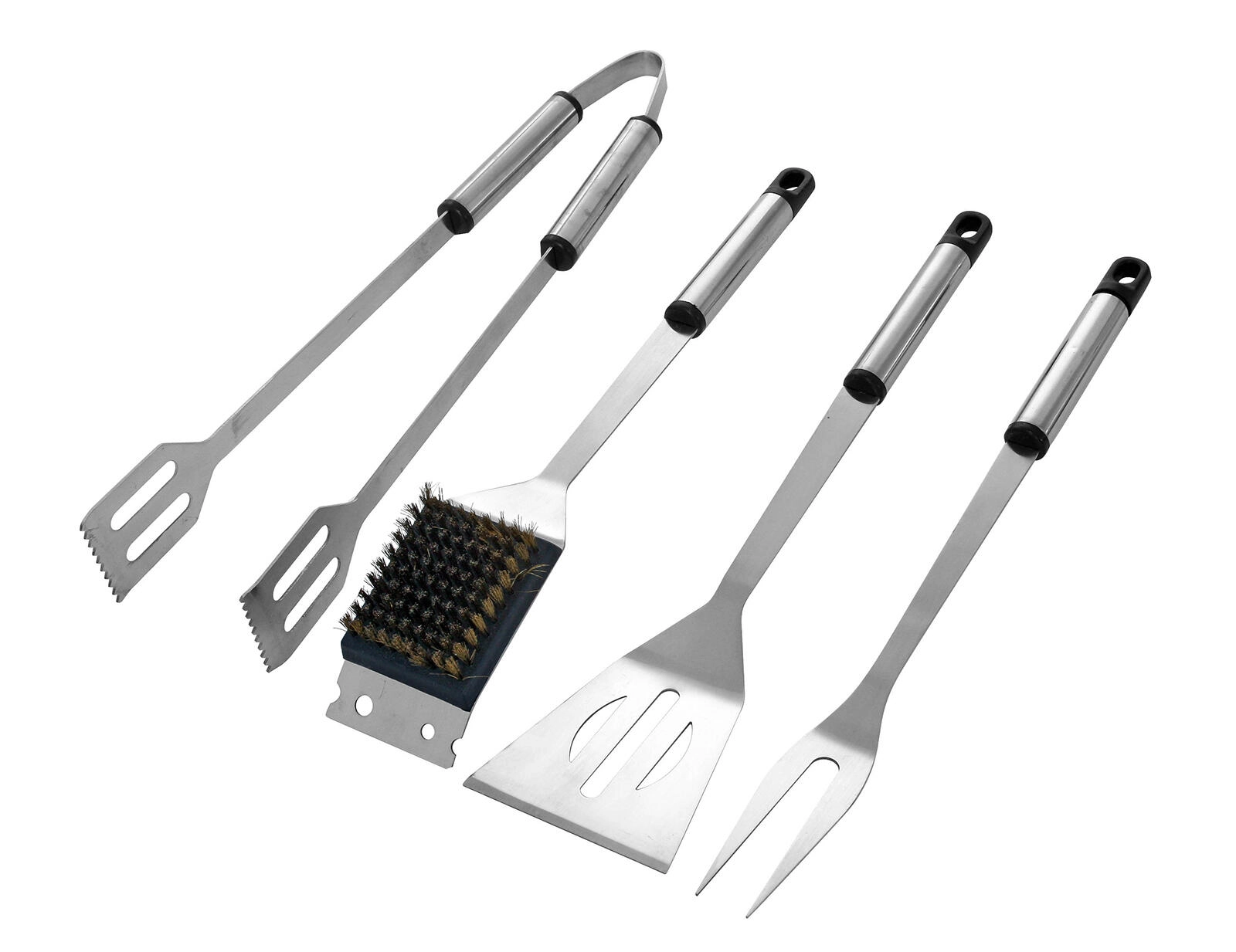 Praktická výbava zahŕňa kliešte na bezpečnú manipuláciu s mäsom a zeleninou, obracačku na jednoduché otáčanie, vidličku na napichovanie a pridržiavanie a kefku na údržbu roštu. Každý kus je vybavený očkom na zavesenie, takže nástroje môžete mať vždy po ruke a prehľadne uložené pri grile.