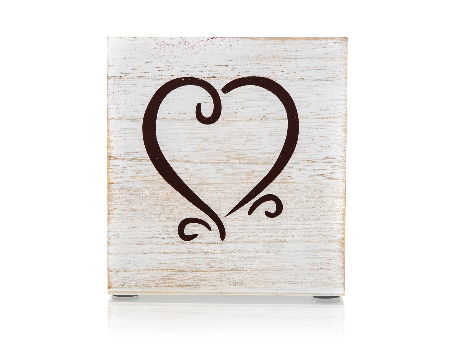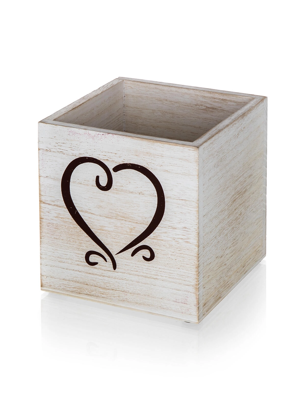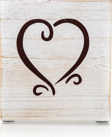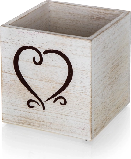 Biela patina a decentný motív srdca dodajú každej polici či pracovnému stolu útulný, domácky charakter.