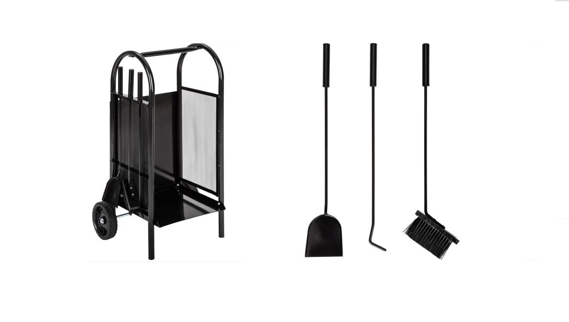 Praktická sada ku krbu s integrovaným úložným priestorom na polená pre poriadok pri krbe aj elegantný vzhľad. Obsahuje lopatku, pohrabáč a metličku, je vyrobená z odolného kovu s hrúbkou 1,0 mm a vyniká stabilnou konštrukciou v čiernej farbe.