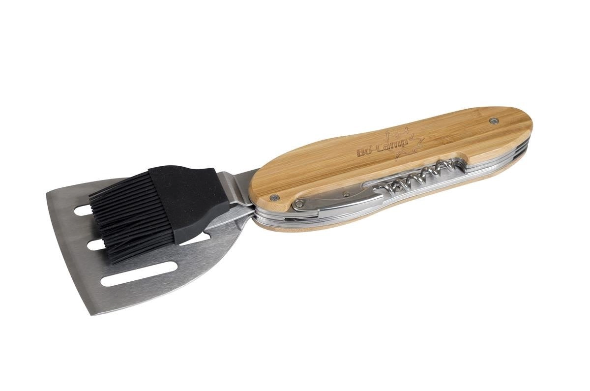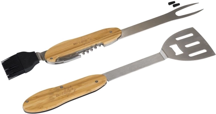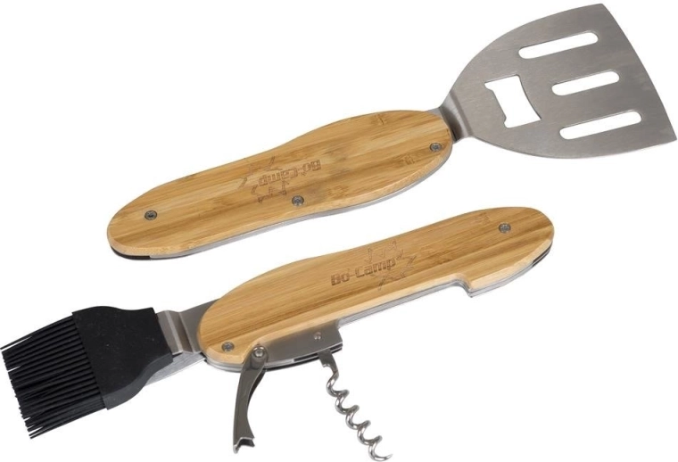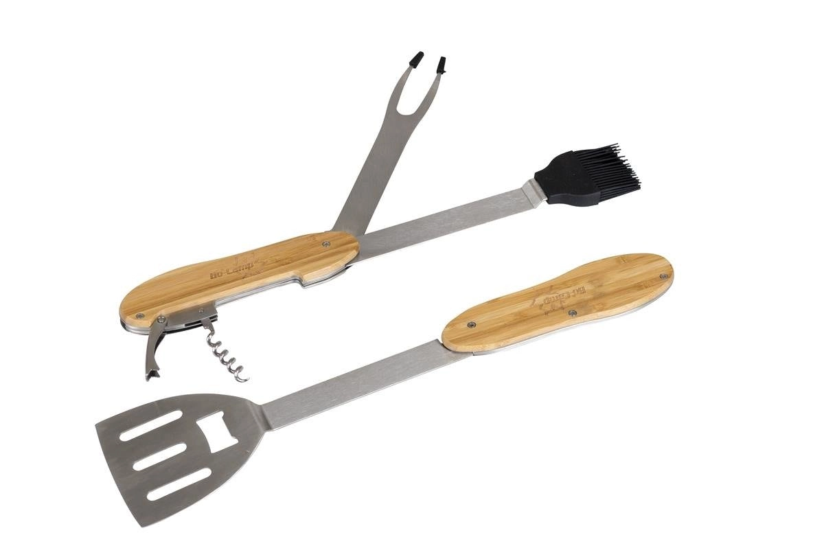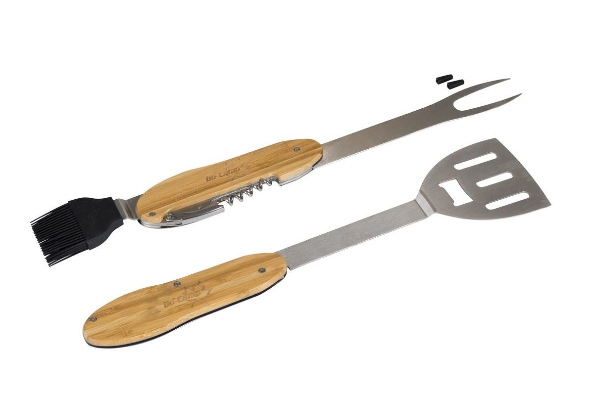 Praktické a odolné grilovacie náradie 5v1 kombinuje obracačku, vidličku, silikónový mašľovač, vývrtku a otvárač fliaš v jednom kompaktnom sete. Ergonomické bambusové rukoväte a nehrdzavejúca oceľ zaistia pohodlné a dlhotrvajúce používanie pri každom grilovaní.