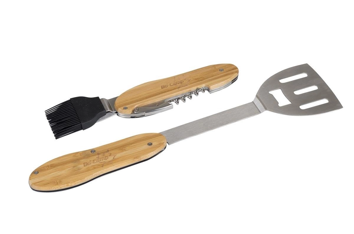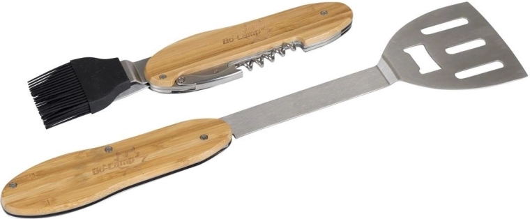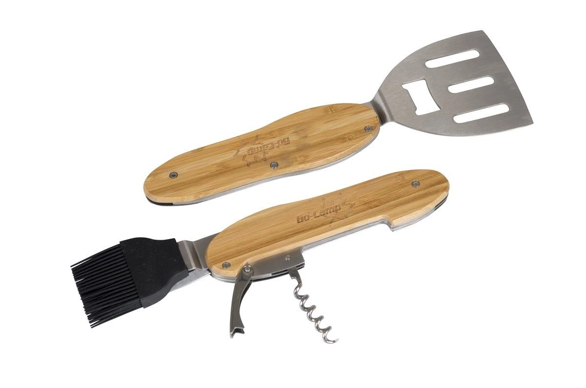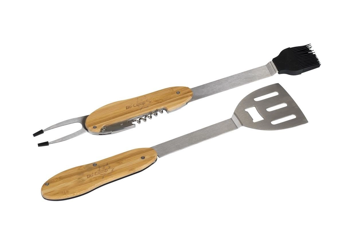 Praktické a odolné grilovacie náradie 5v1 kombinuje obracačku, vidličku, silikónový mašľovač, vývrtku a otvárač fliaš v jednom kompaktnom sete. Ergonomické bambusové rukoväte a nehrdzavejúca oceľ zaistia pohodlné a dlhotrvajúce používanie pri každom grilovaní.