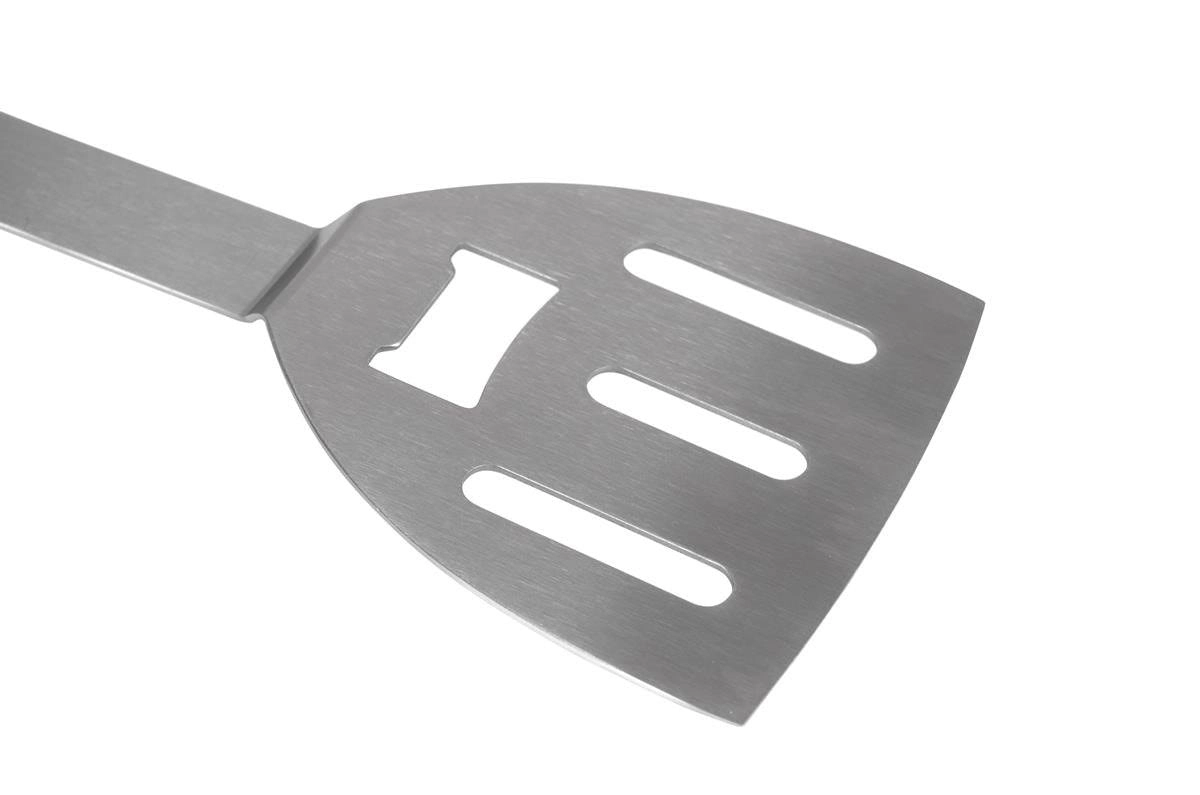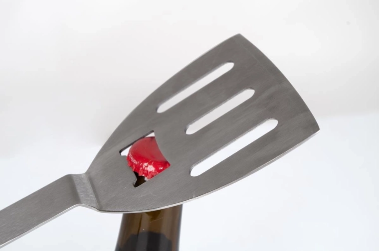 - 5 funkcií v jednom: obracačka so štrbinami a otváračom, grilovacia vidlička, silikónový mašľovač, vývrtka.
