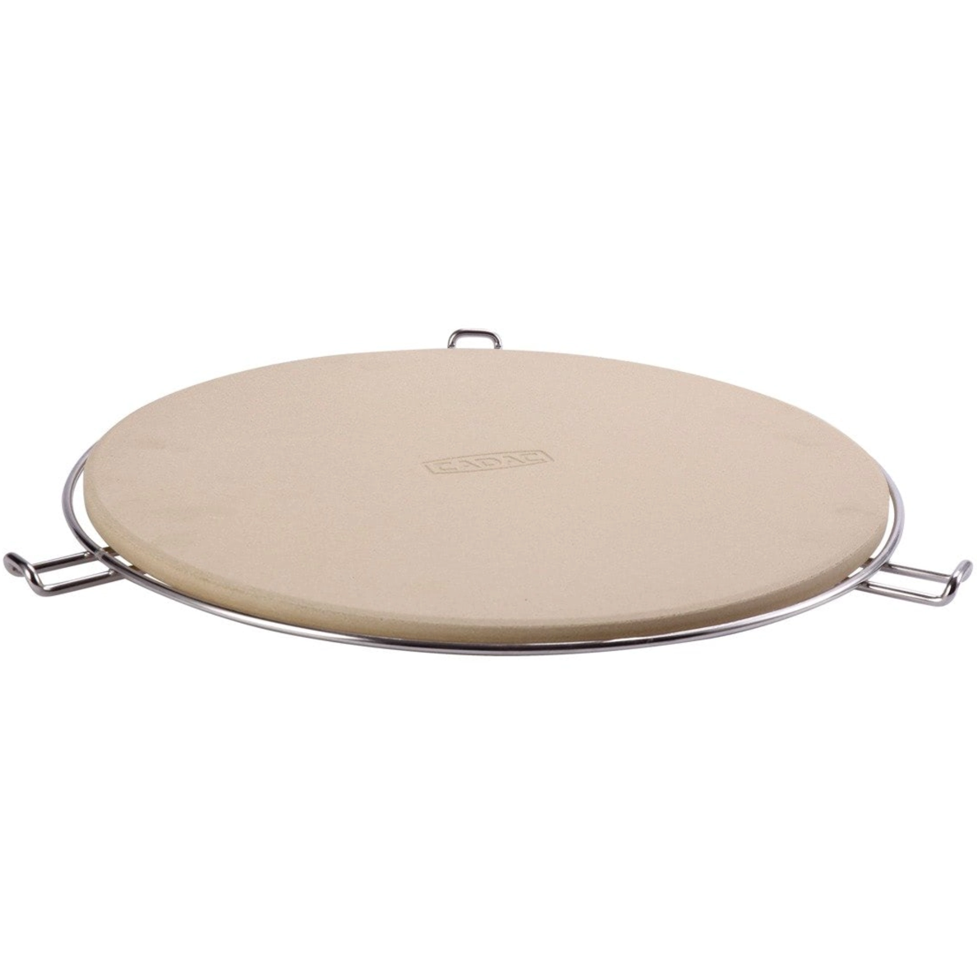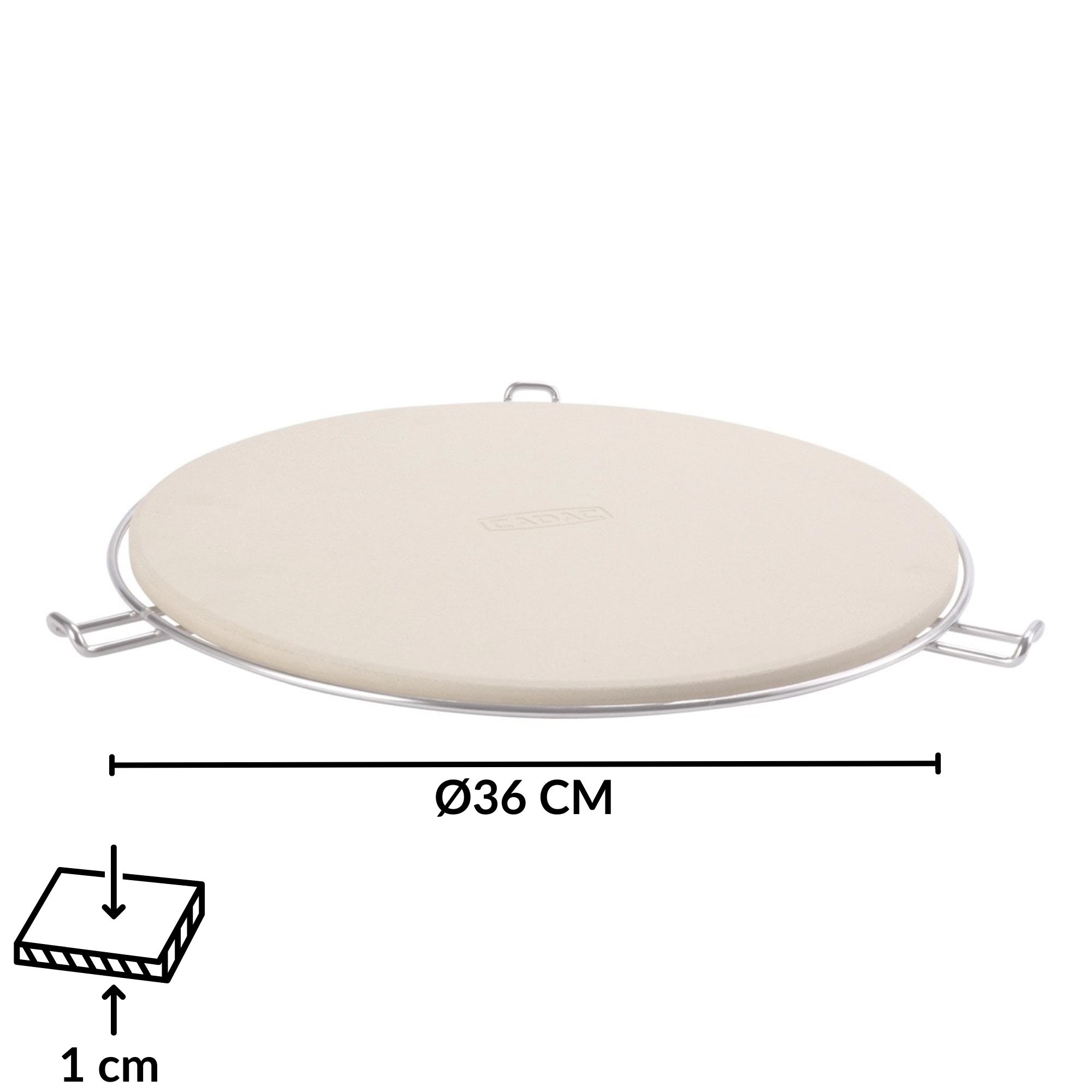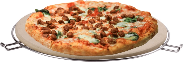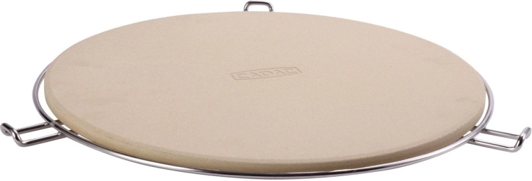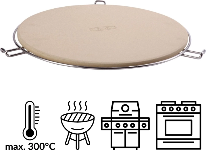 Súčasťou balenia je chrómovaný stojan s bočnými úchytmi, ktorý uľahčuje prenášanie rozpáleného kameňa z grilu či z rúry na stôl. Vďaka odolnosti do 300 °C a univerzálnemu okrúhlemu tvaru je perfektný na pizzu, focacciu aj chlieb.