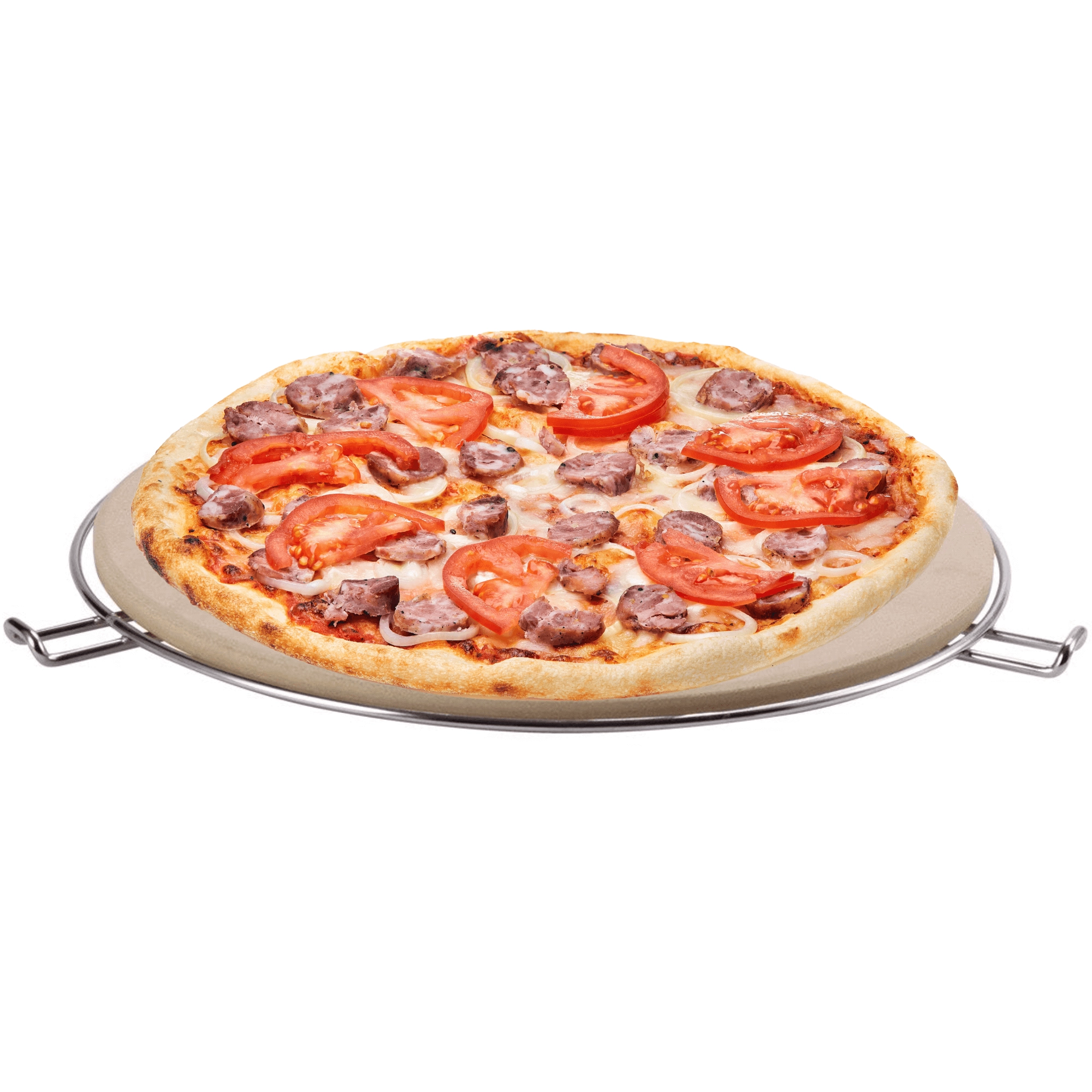 Chrómovaný drôtený stojan s bočnými rukoväťami umožňuje pohodlné prenášanie kameňa z rúry či grilu priamo na stôl.