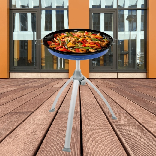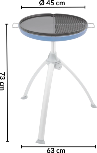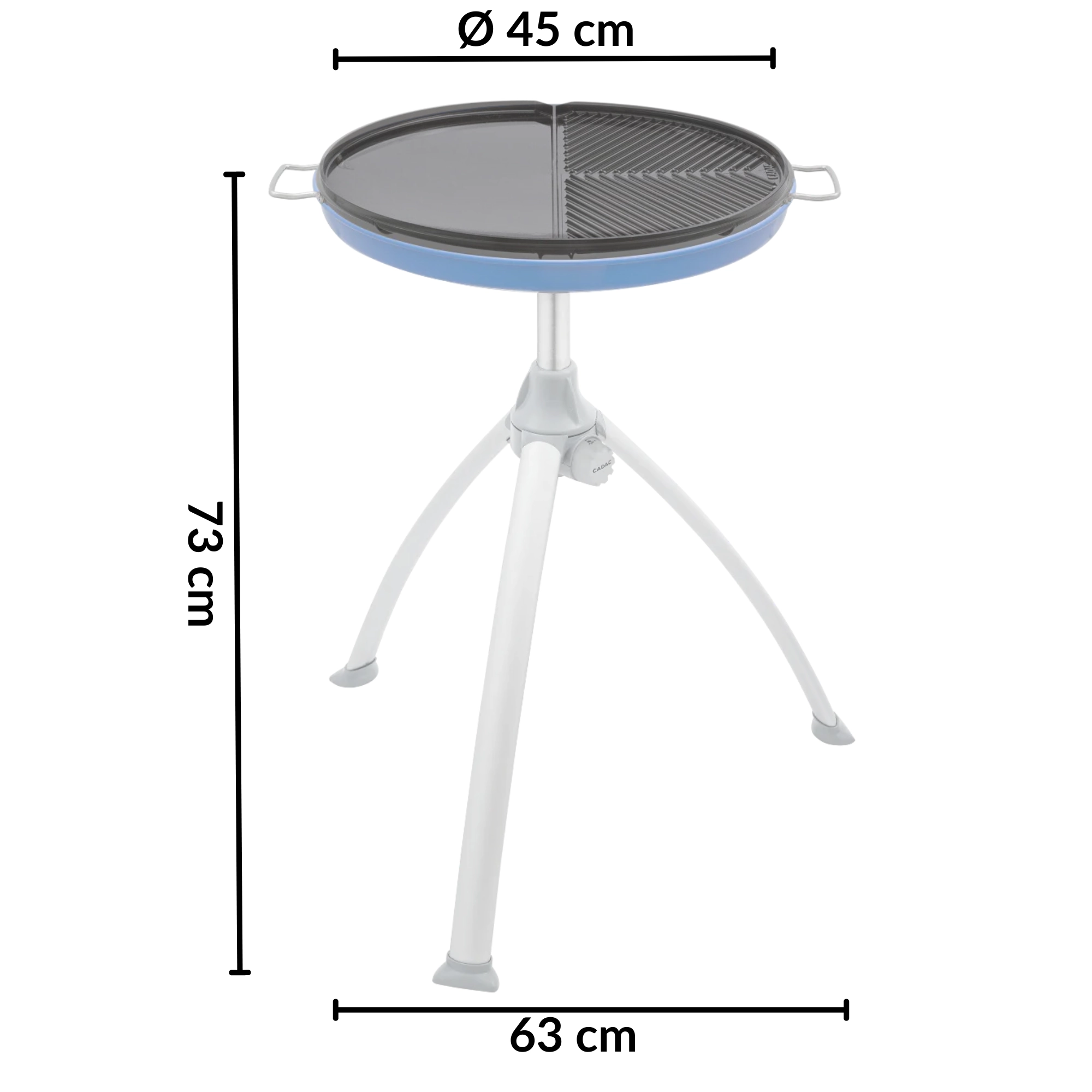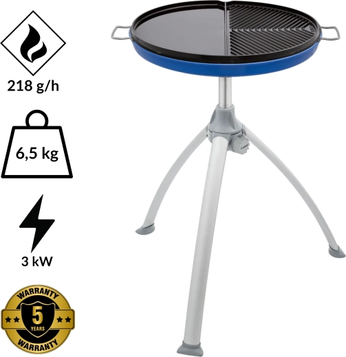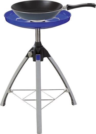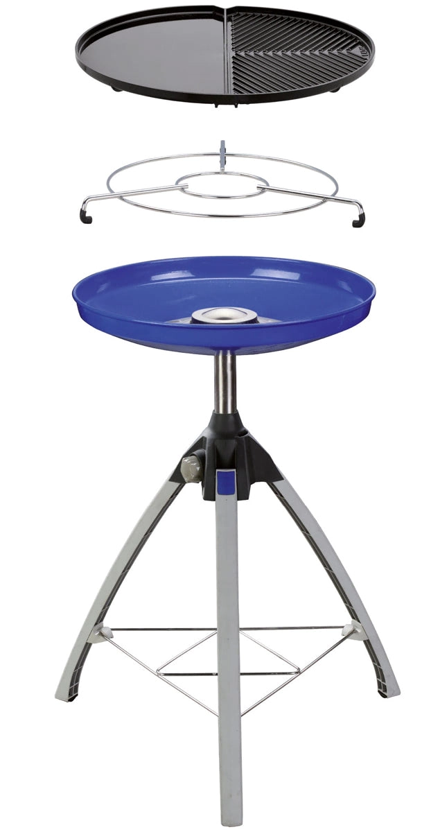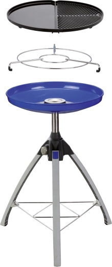 Stabilný, no ľahký skladací trojnožkový stojan z anodizovaného hliníka sa ľahko balí a hodí sa na kemping, chatu aj záhradu. Gril má presnú reguláciu plameňa, veľkú plochu 45 cm a odnímateľnú policu na korenie. Prevádzka na opakovane plniteľnú plynovú fľašu s hadicou a regulátorom (nie sú súčasťou).