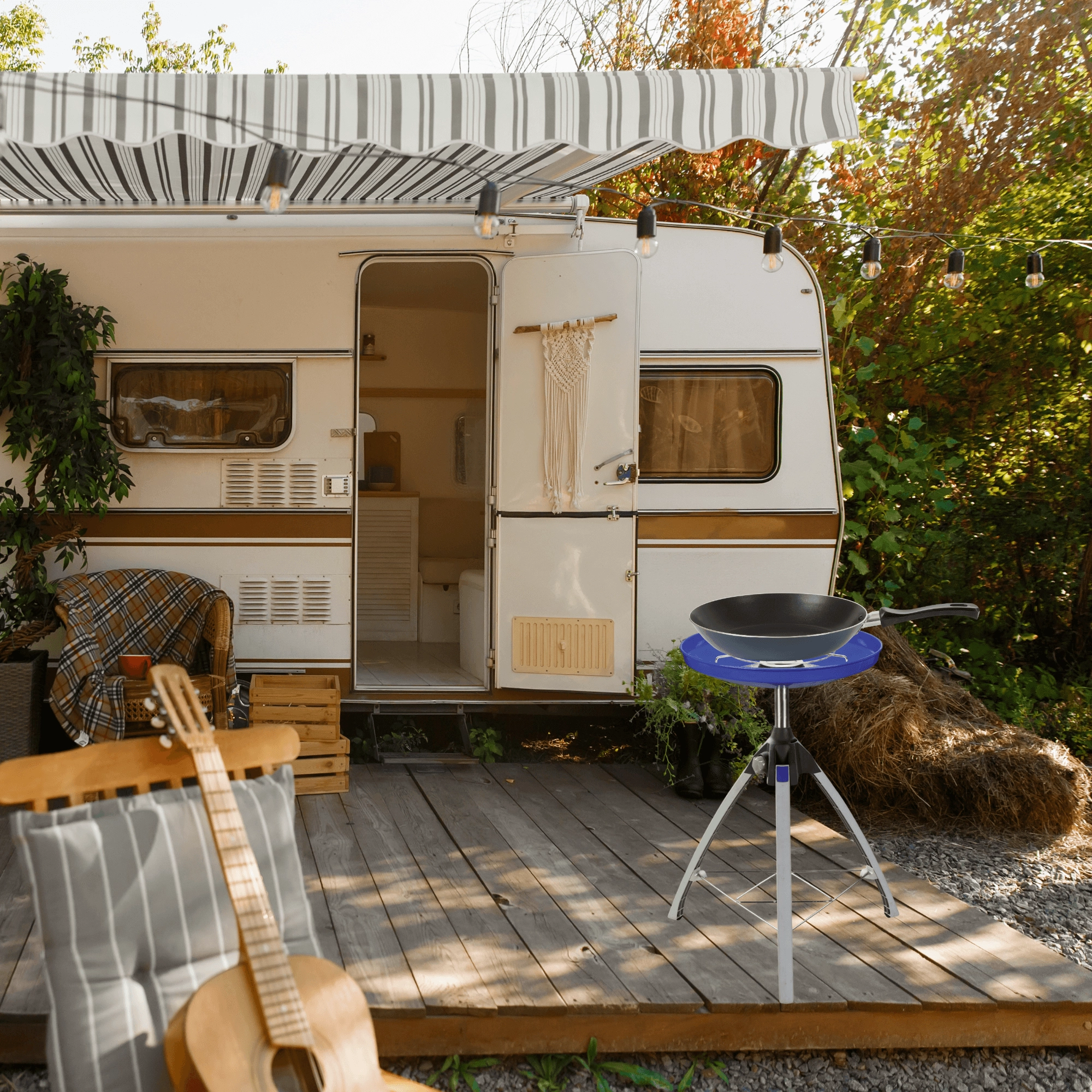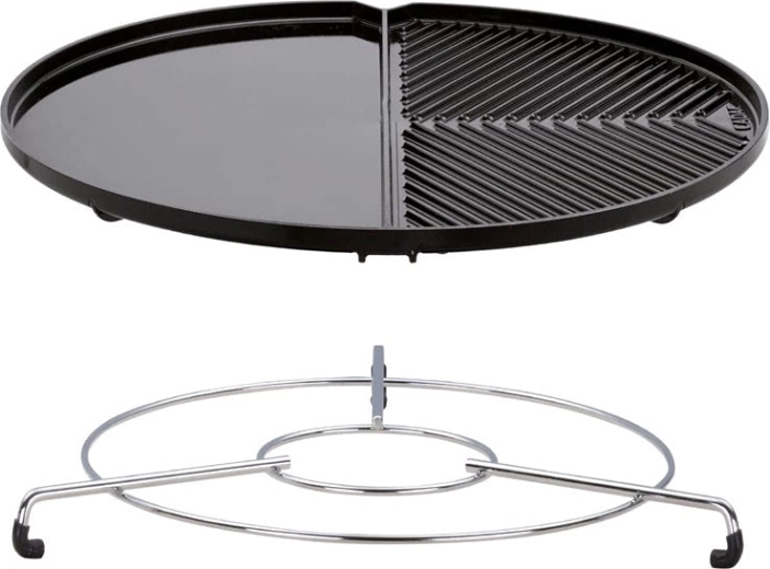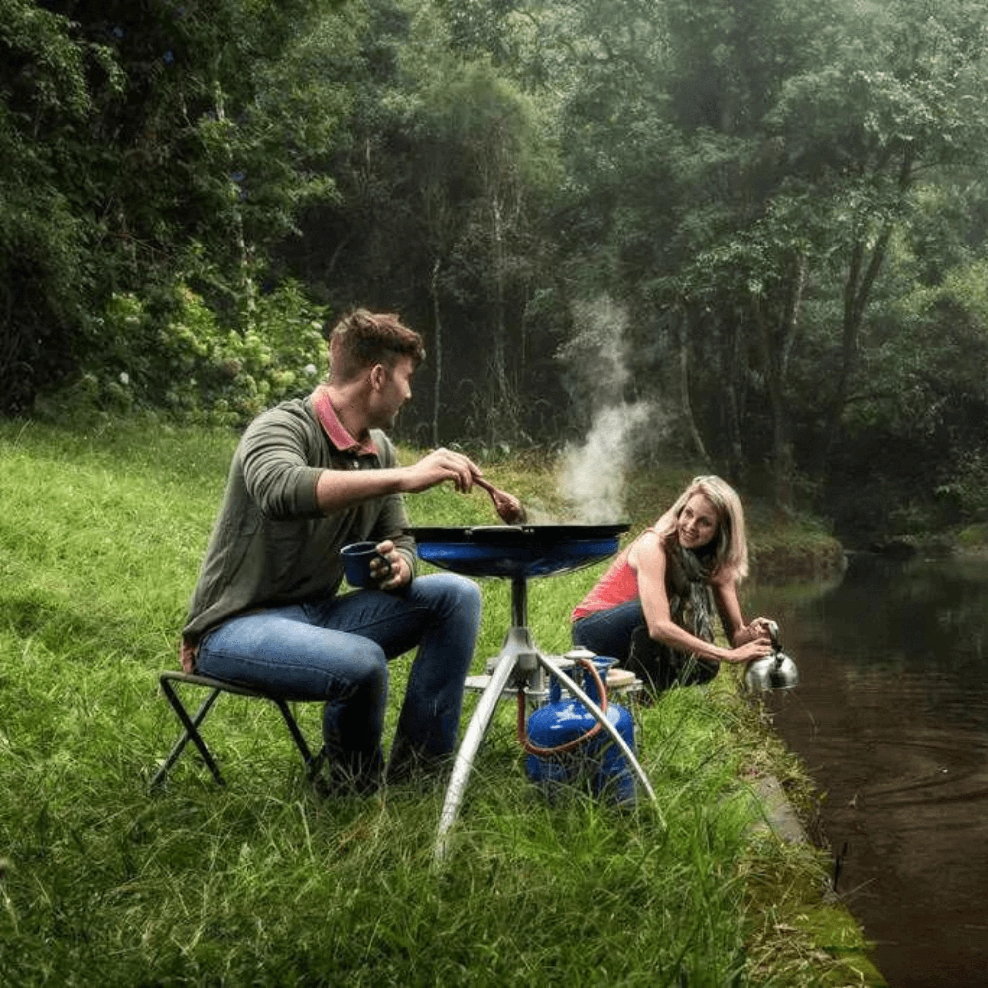 Univerzálny vonkajší varič a gril v jednom na kempovanie aj záhradu. Vďaka obojstrannej nepriľnavej doske s polovicou hladkej a polovicou rebrovanej plochy pripravíte mäso, ryby, zeleninu aj palacinky súčasne. Ľahký skladací trojnožkový stojan, podstavec na hrniec a praktická taška v balení. Presná regulácia plameňa, veľká plocha 45 cm a prevádzka na plynovú fľašu.