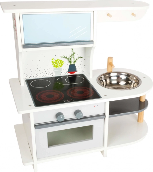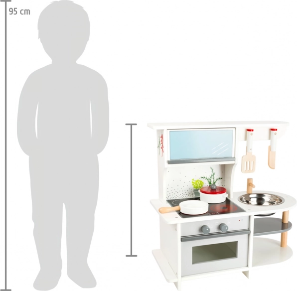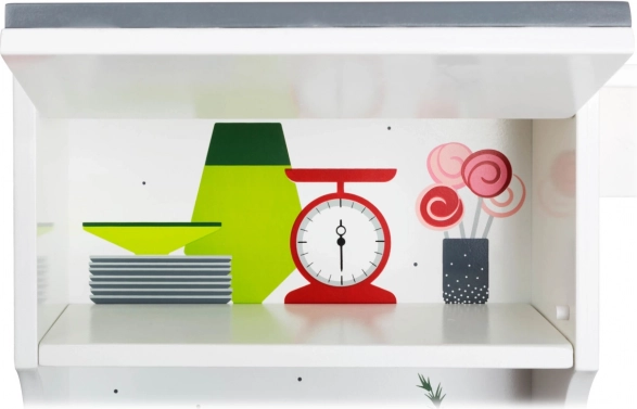 Presvedčivosť hry dodávajú otáčacie gombíky s cvakavými zvukmi, zatiaľ čo rúra s magnetickým zatváraním slúži ako praktický úložný priestor. Kuchynka ďalej obsahuje ďalšie police a háčiky pre uloženie maketových potravín a riadu.