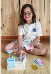 Táto odolná pokladňa v minimalistickom dizajne perfektne zapadne do detskej izby aj herne. Deti môžu zadávať cenu na klávesnici, platiť bankovkami alebo kartou a precvičovať základné početné operácie.