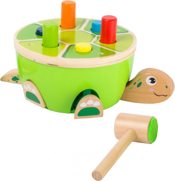 Korytnačka s farebnými kolíkmi vtiahne deti do šikovnej mechanickej hry: keď zatlčú jeden kolík, ďalší sa automaticky vysunie. Pri údere sa navyše vysúvajú nohy, hlava aj chvost korytnačky, takže je každé klepnutie odmenené zábavným efektom a okamžitou spätnou väzbou.