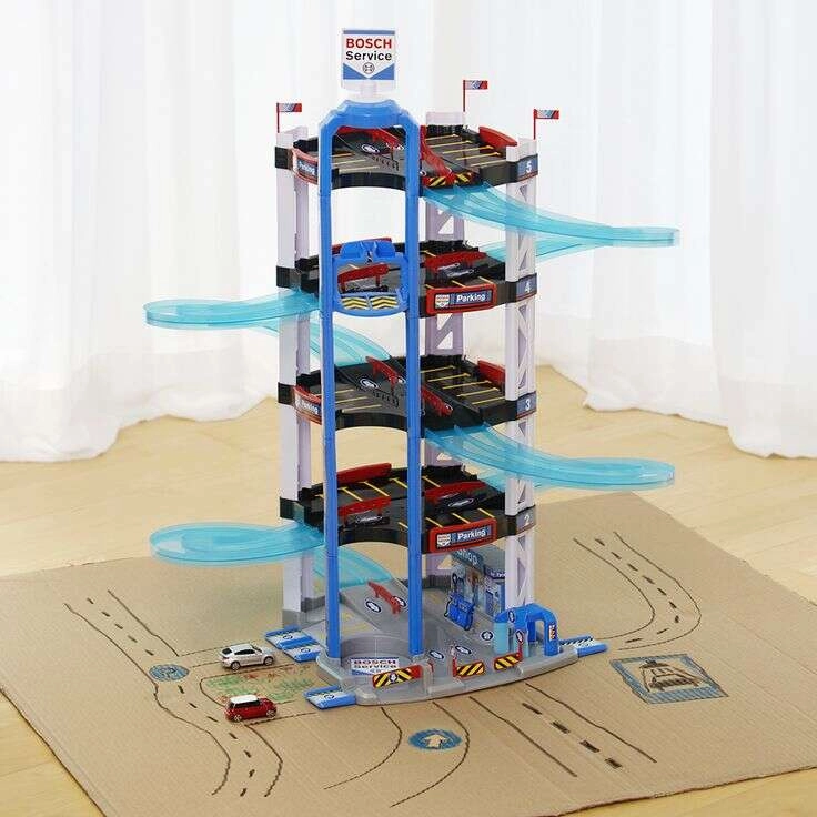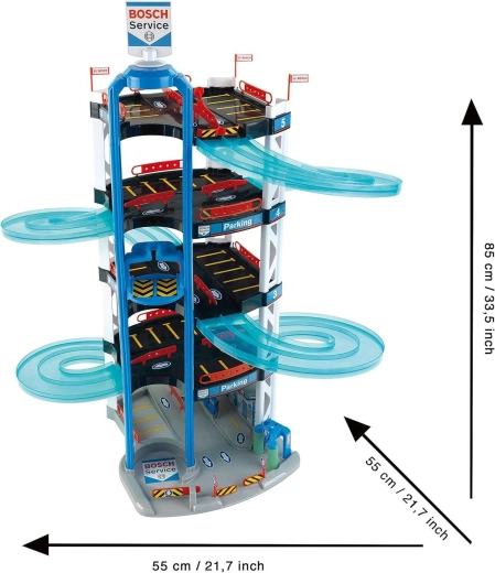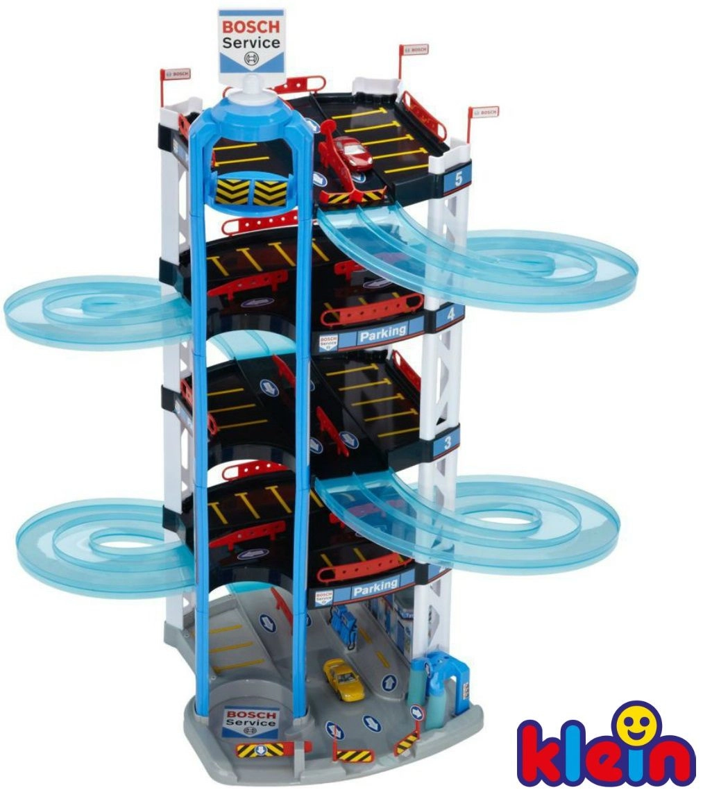 Tento robustný 5-poschodový parkovací garážový komplex BOSCH Service od značky Klein je stvorený pre malých pretekárov. Ponúka polopriehľadné dvojité špirálové rampy od najvyššieho poschodia až nadol, ručne ovládaný výťah na presun autíčok medzi poschodiami a štart/cieľ pretekov pre dve autíčka. Na jednotlivých úrovniach nájdete dostatok parkovacích miest a na prízemí navyše servisnú zónu so „stanicou“ pre realistickú hru.