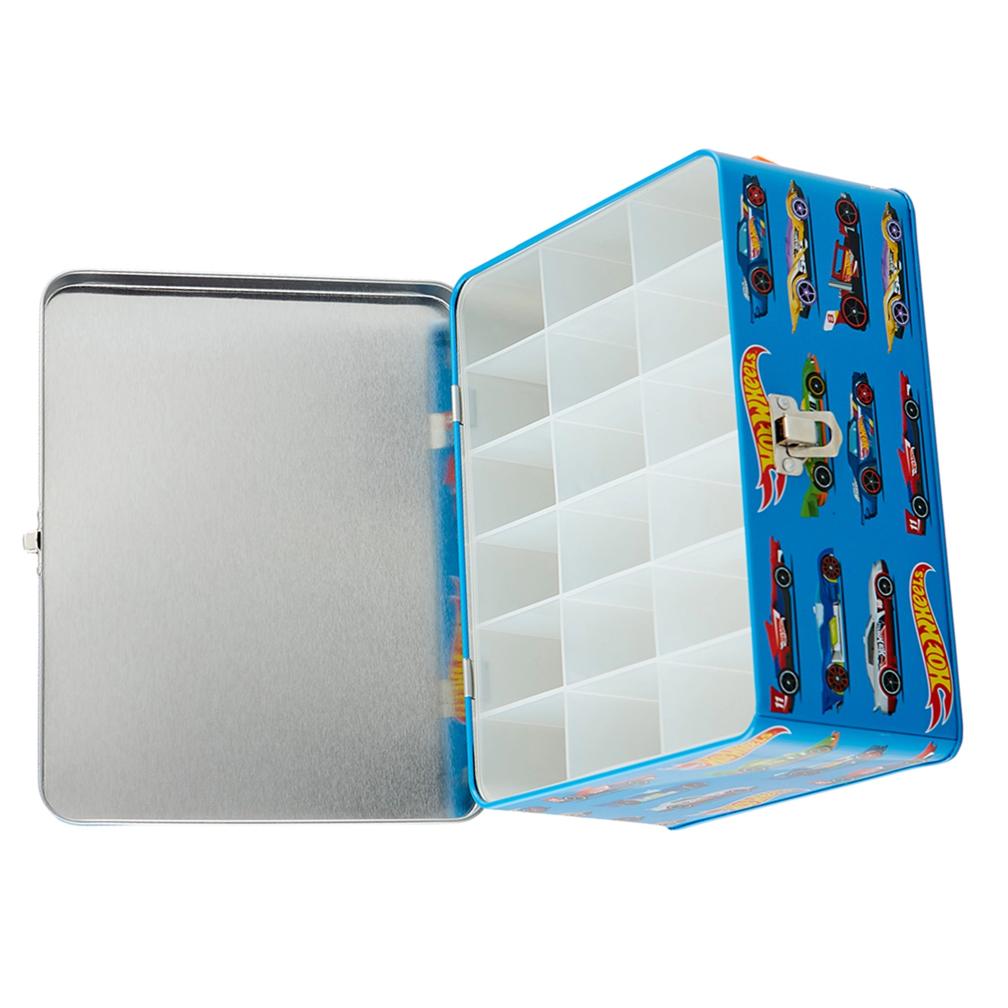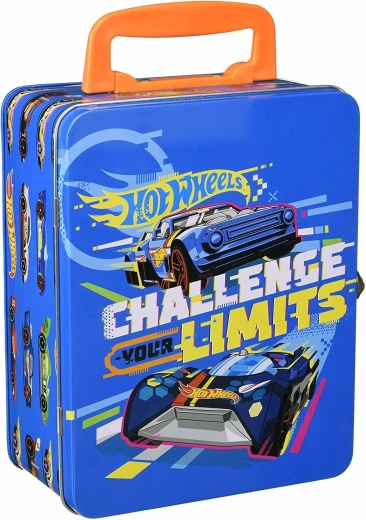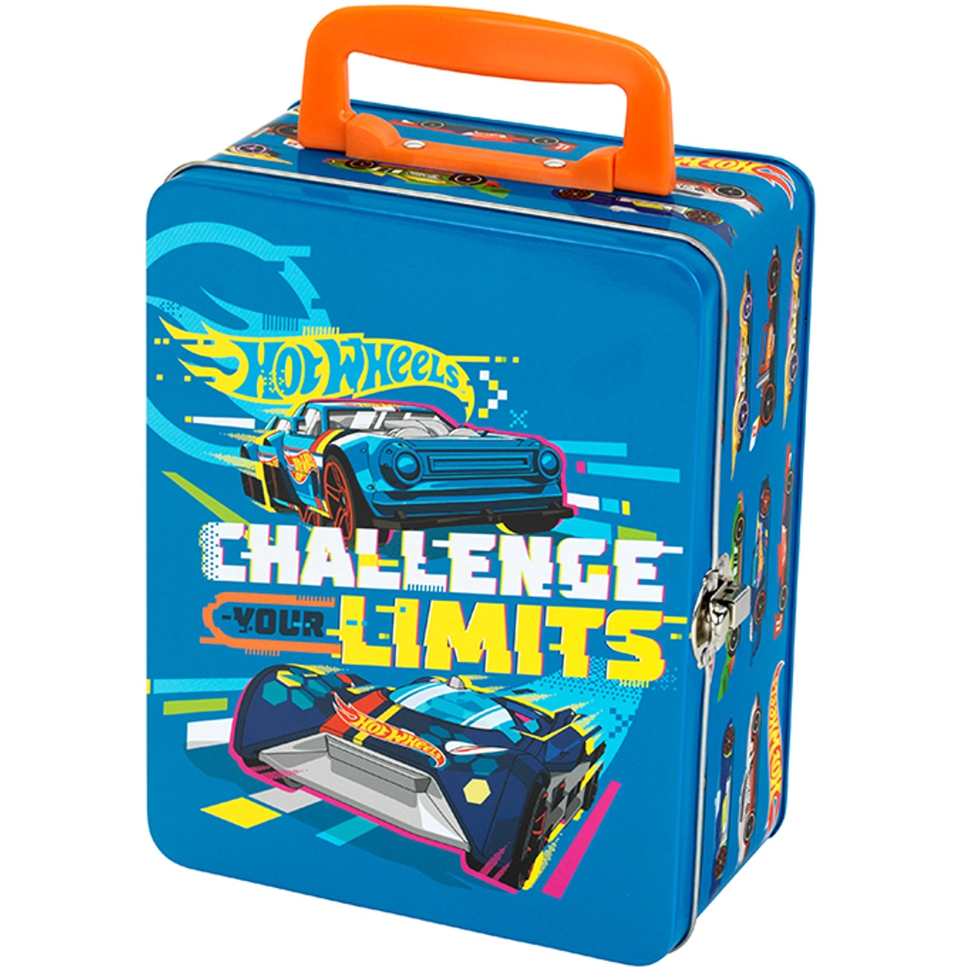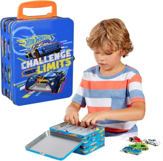 Tento štýlový modrý kufrík s grafikou pretekárskych áut a sloganom „Challenge Your Limits“ je skvelým riešením pre všetkých malých zberateľov. Vo vnútri nájdete vyberateľnú mriežku s 18 samostatnými priehradkami, ktoré udržia autíčka prehľadne oddelené a chránené. Robustná kovová konštrukcia a spoľahlivé prackové zapínanie zaistia bezpečné uloženie pri prenášaní.