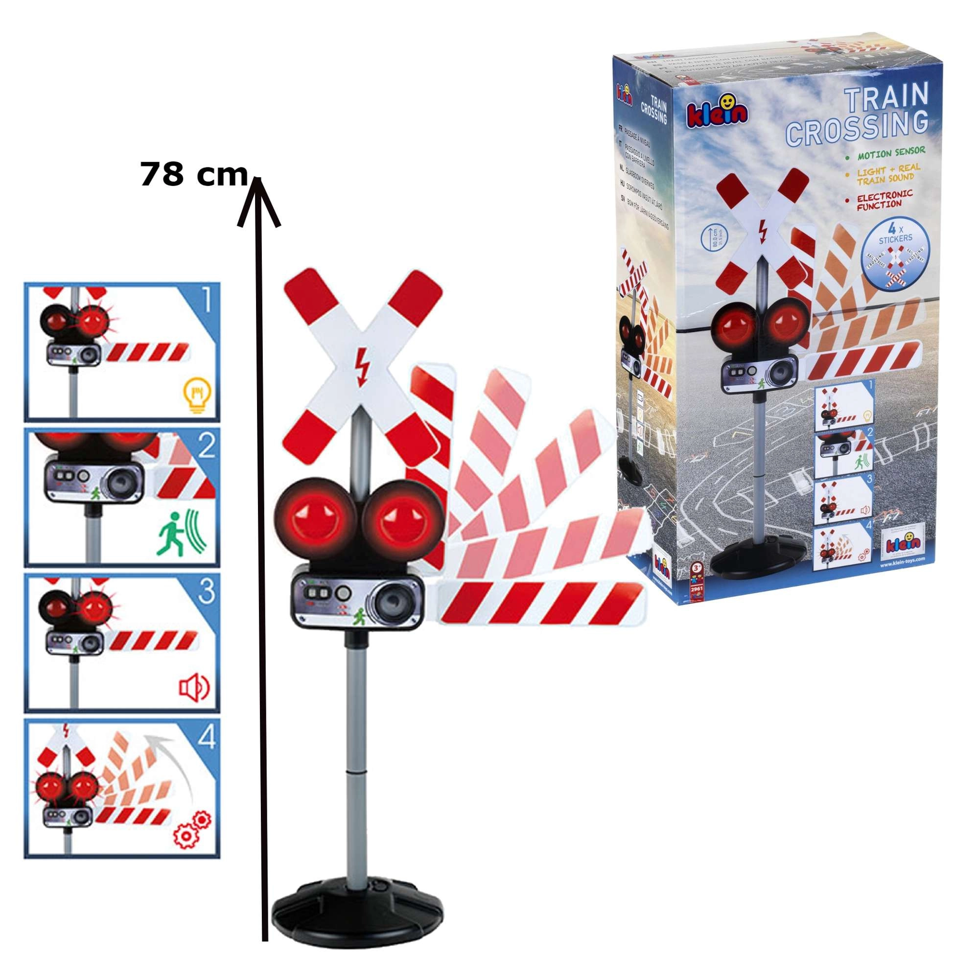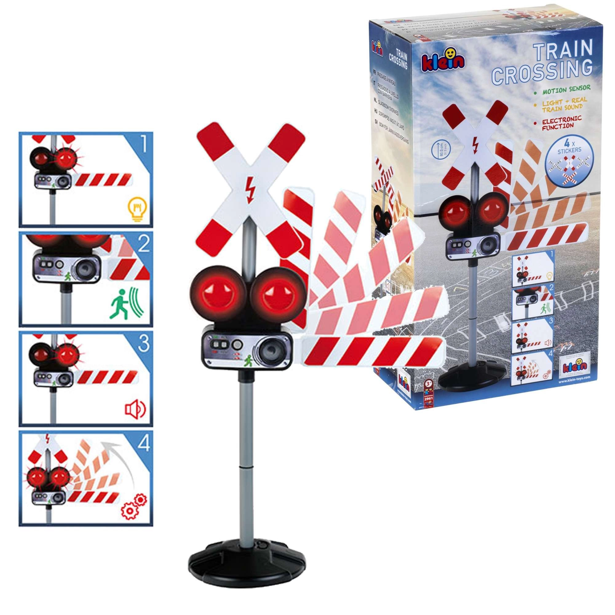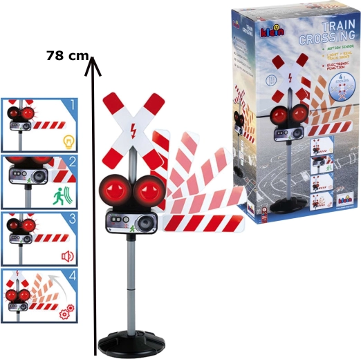 Dve červené blikajúce svetlá a autentické zvuky vlaku vytvárajú skutočnú atmosféru železničného priechodu, ktorá deti okamžite vtiahne do hry.