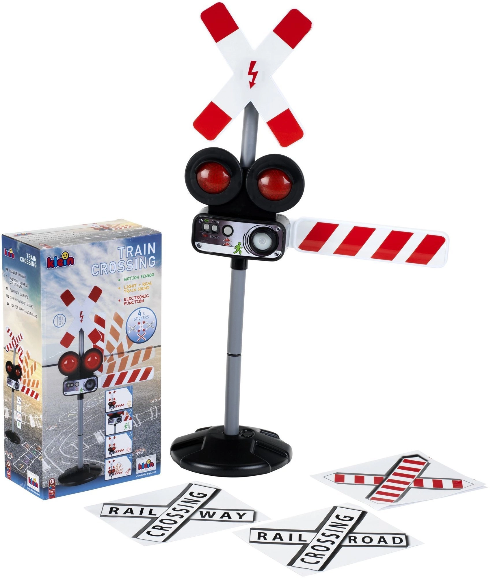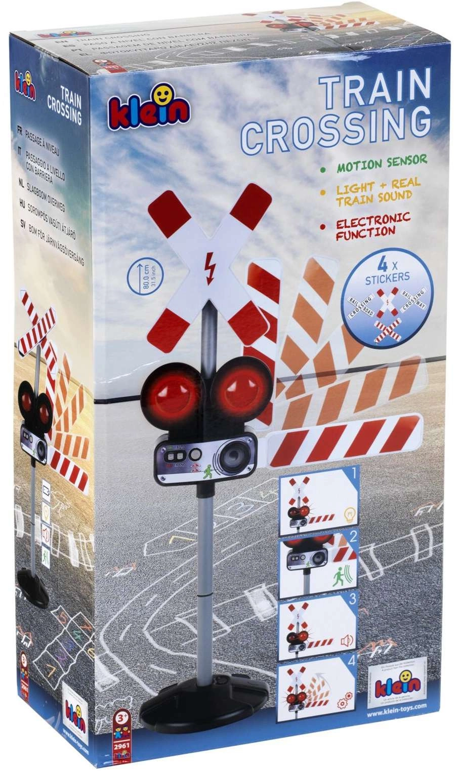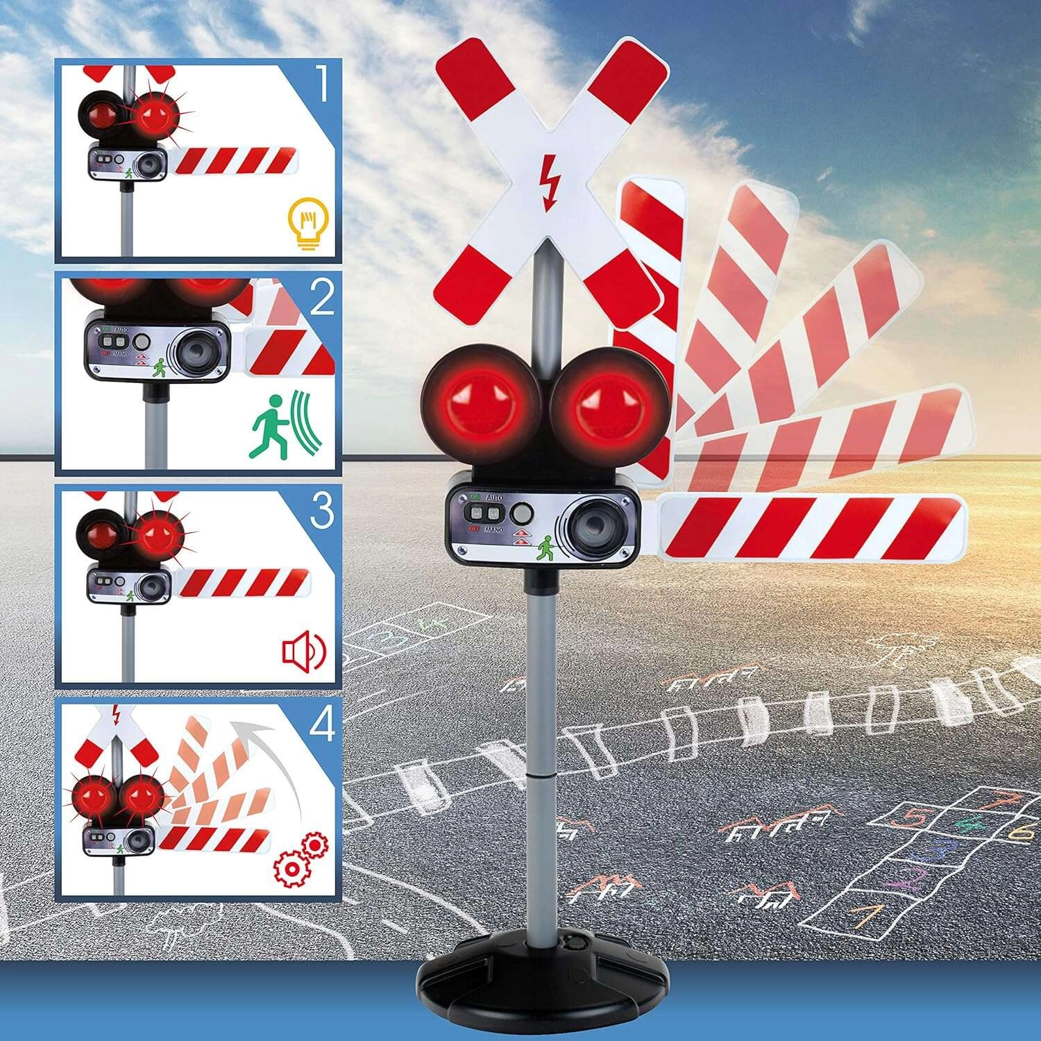 Dve červené blikajúce svetlá a autentické zvuky vlaku vytvárajú skutočnú atmosféru železničného priechodu, ktorá deti okamžite vtiahne do hry.