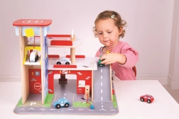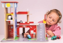 Deti si užijú zábavnú hru na každom z troch poschodí garáže s parkoviskom. Na prízemí môžu autom vojsť do funkčného výťahu a následne vyjsť až na druhé poschodie a zaparkovať. Na prízemí deti nájdu servis, umyvárku aj pumpu. Z prvého poschodia môžu autá odchádzať pomocou výťahu alebo po rampe, ale pozor, autá musia počkať na zdvihnutie závory! Najvyšším bodom garáže je heliport. Táto garáž má jednoducho všetko, čo malý vodič potrebuje na presun z bodu A do bodu B. Podporuje kreativitu a predstavivosť. Rozvíja koordináciu ruka-oko, jemnú motoriku a zručnosť. Možno doplniť autíčkami Bigjigs Toys a Bigjigs Rail. Vyrobené z kvalitných materiálov zodpovedných zdrojov. Hlavné vlastnosti: 3 poschodia s parkoviskom a heliportom, funkčný výťah, servis, umyvárka aj pumpa na prízemí