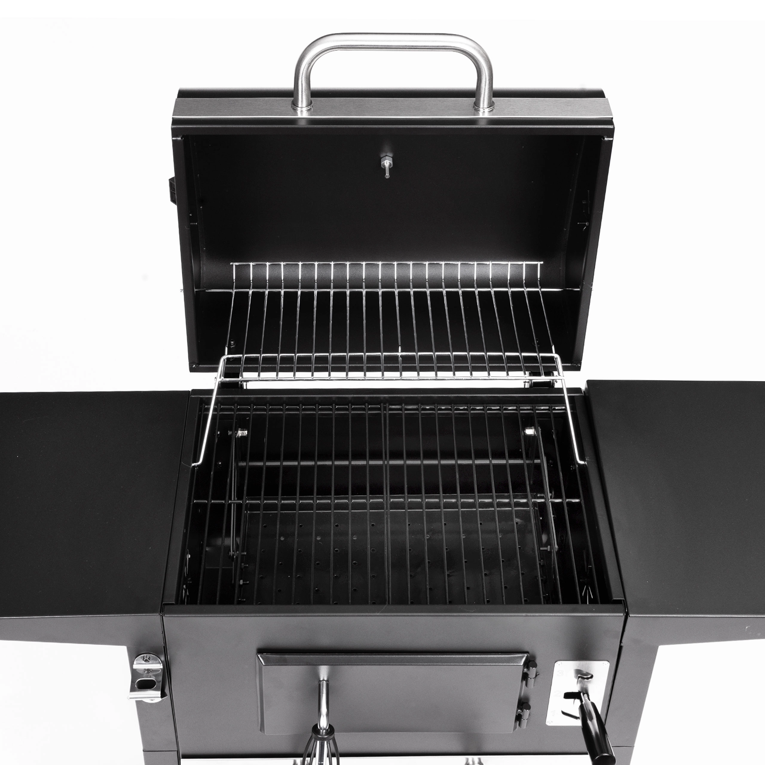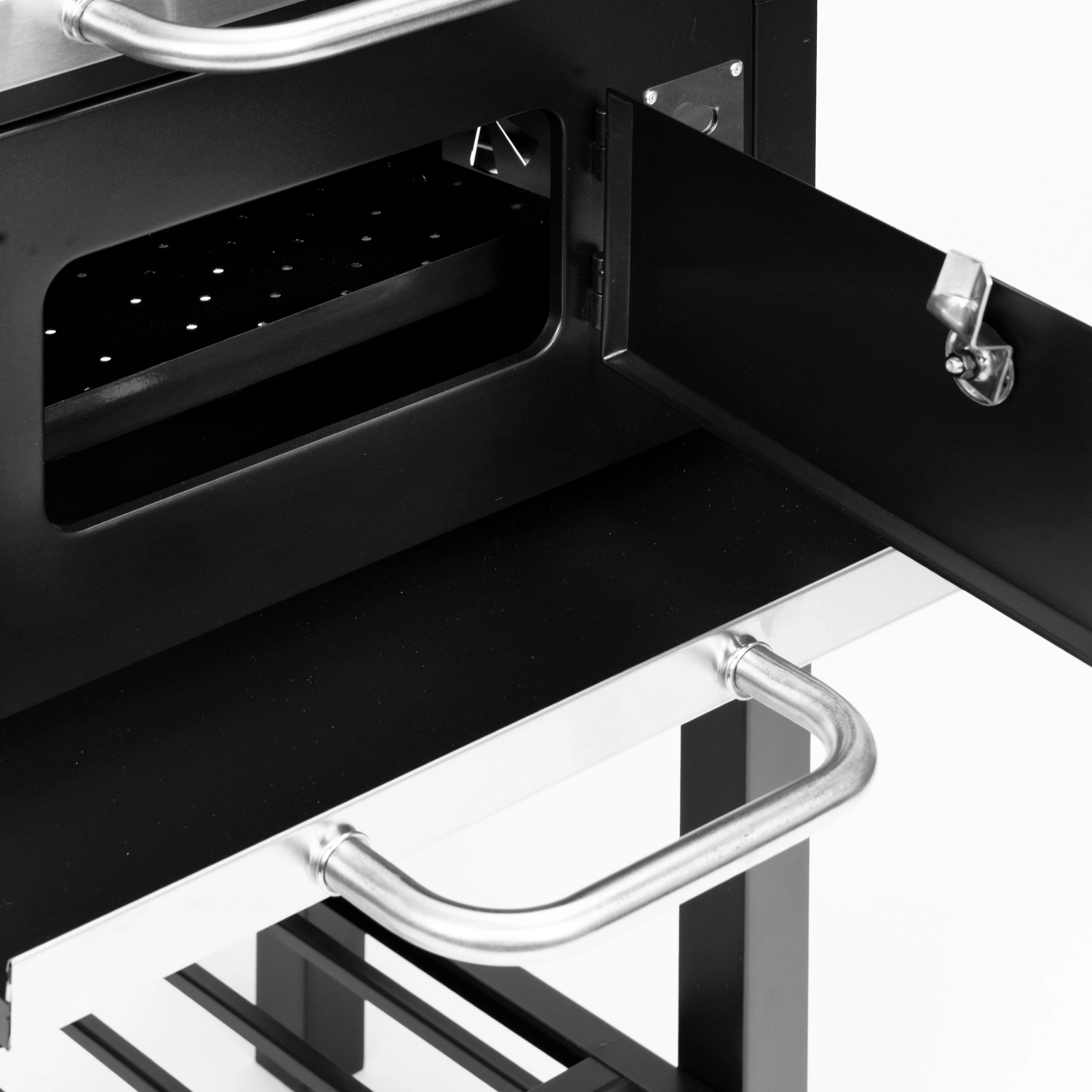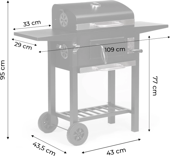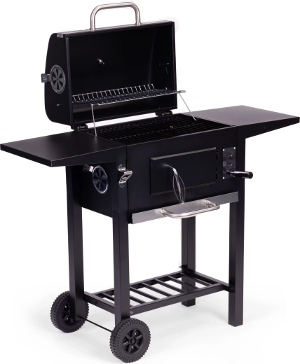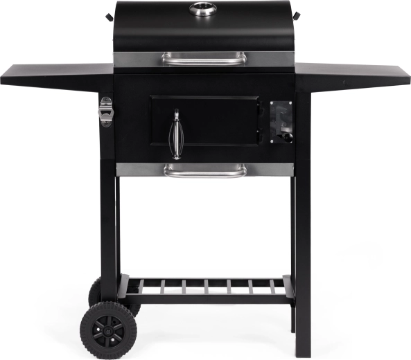 Hlavný rošt 45×33 cm dopĺňa horný ohrievací rošt 38×19 cm na udržanie hotových jedál v teple. Dve bočné police 33×29 cm poskytujú miesto pre koreniny a príslušenstvo, spodná odkladacia mriežka zlepšuje organizáciu práce. Vďaka výsuvnému popolníku je údržba rýchla a čistá, predné dvierka ohniska uľahčia dopĺňanie uhlia počas grilovania.