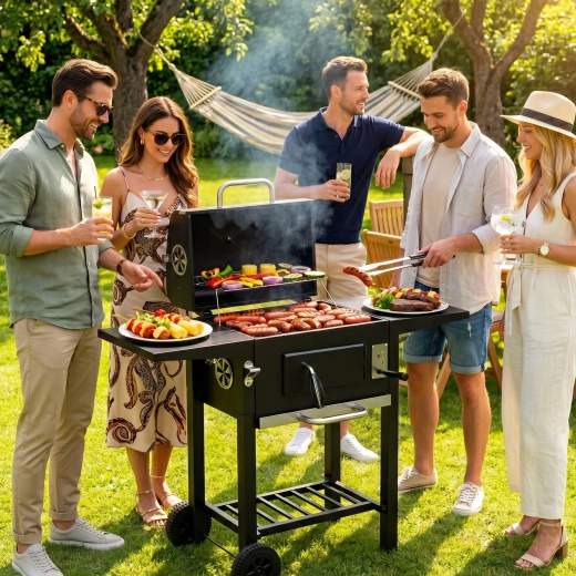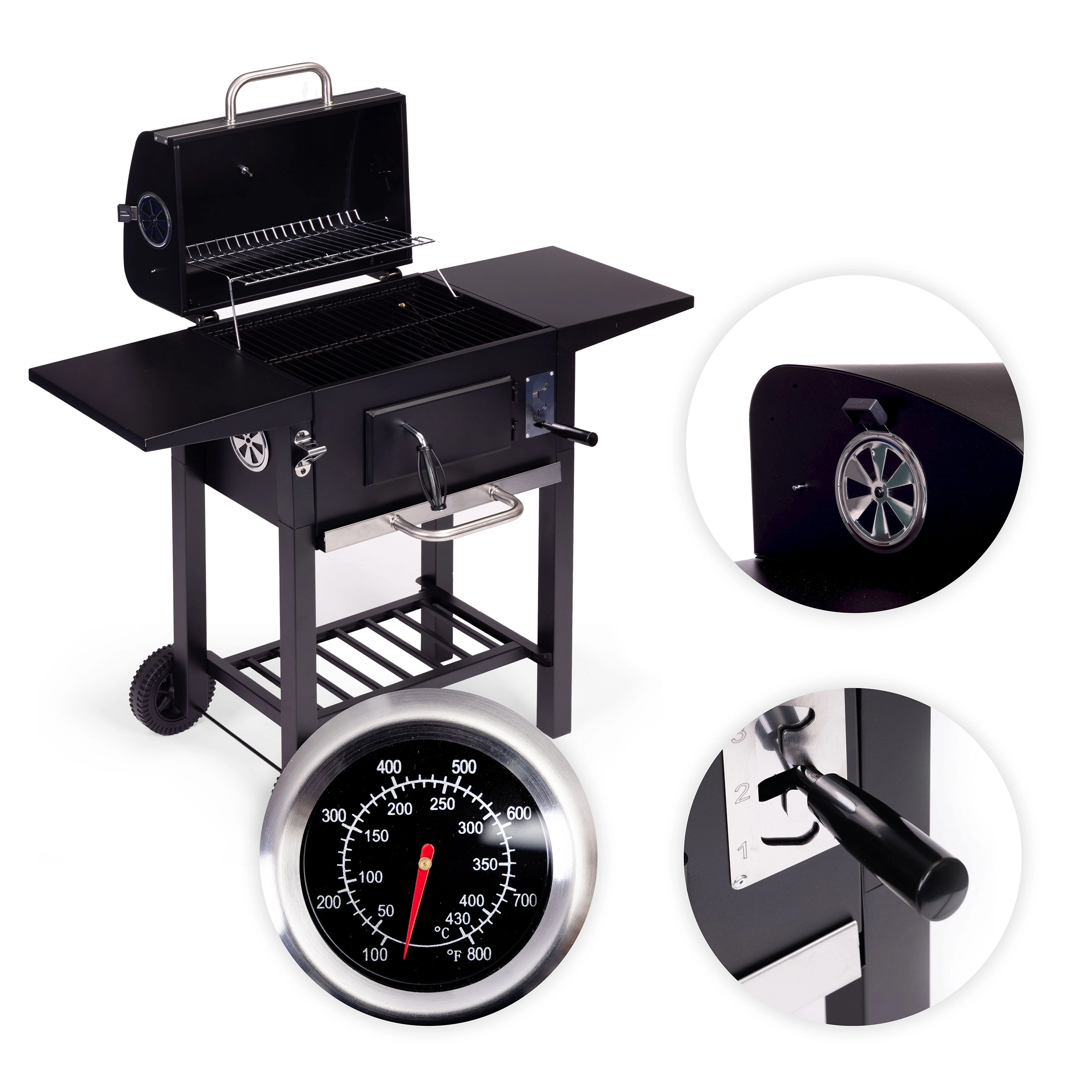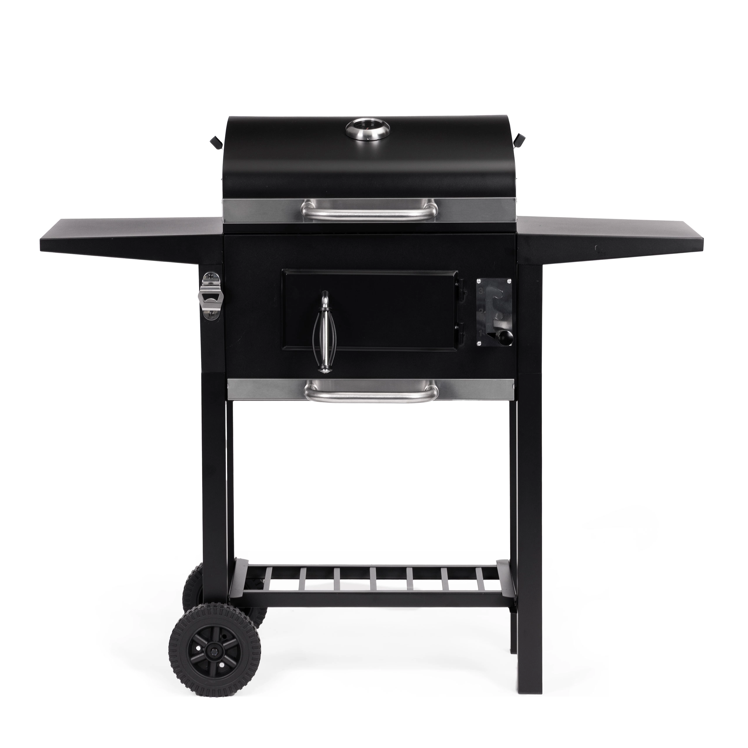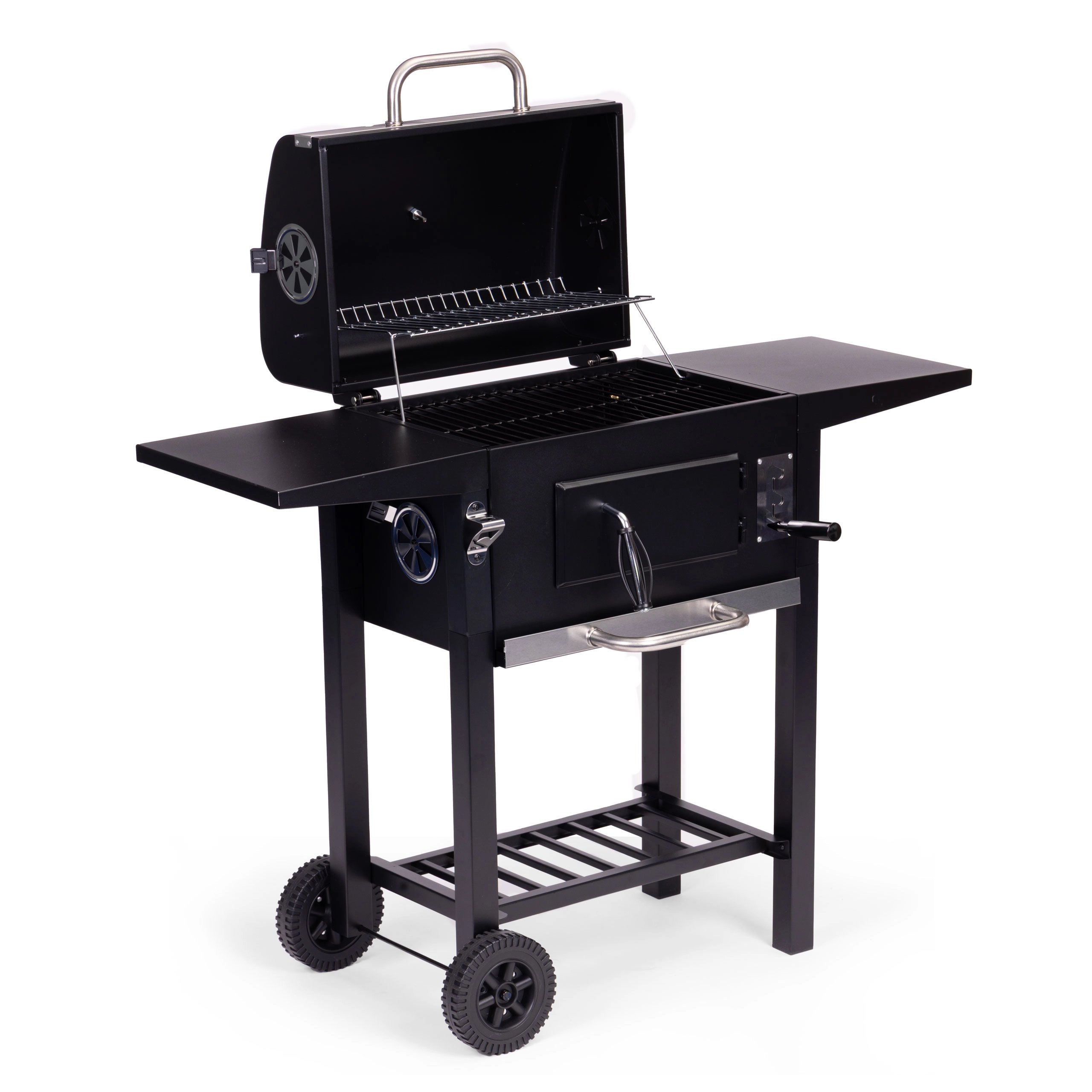 Pomocou 3-úrovňového nastavenia výšky roštu a vetracích otvorov presne regulujete výkon – od prudkého opekania až po jemné dohrievanie. Transportné kolesá umožnia jednoduché presunutie grilu na ideálne miesto. Praktický otvárač na fľaše je príjemným bonusom pre pohodové chvíle s rodinou a priateľmi.